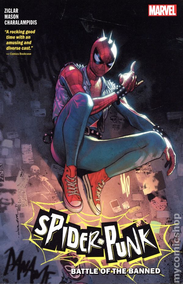 2nd and later printings. Collects Spider-Punk (2022 Marvel) #1-5. Written by Cody Ziglar. Art by Justin Mason. Cover by Olivier Coipel. Back Cover by Mike Del Mundo. Anarchy in the Spider-Verse! Hobie Brown is the head-spiked Spider-Punk - all set to protect Earth-138 with his ax in hand and his chaotic band of punkheroes backing him! But even though the Norman Osborn of Hobie's dimension is dead, will the chaos he created be too much for Spider-Punk and the gang to handle? What secrets lie under the community center Spidey and his crew call home base? And why is Taskmaster crashing the party to stomp out Spider-Punk? It all ties back to one thing, and Hobie had better figure it out fast. It's time to take to the road in the Spider-Van, but Hobie and crew will soon end up joining Daredevil in the giant shadow of the Kingpin! Prepare for an arachnid adventure like you've never seen before! Kick it! Softcover, 112 pages, full color. RATED T+ Cover price $15.99.