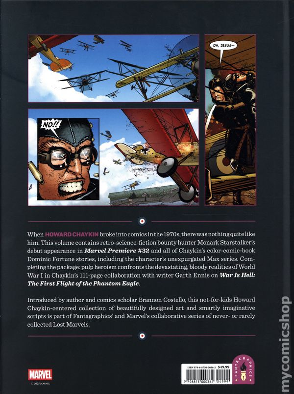 Volume 2 - 1st printing. "Howard Chaykin: Vol. 1!" Written by Howard Chaykin, Mark Gruenwald, Peter Sanderson, Len Wein, David Michelinie, and Garth Ennis. Art by Howard Chaykin, Al Milgrom, Kerry Gammill, Bob Layton, John Burns, and Terry Austin. Cover by Howard Chaykin. Introduction by Brannon Costello. When Howard Chaykin broke into comics in the 1970s, there was nothing quite like him. His original characters Dominic Fortune and Monark Starstalker took classic pulp heroes and ran them through a postmodern blender. This new volume contains retro-science-fiction bounty hunter Monark Starstalkers debut appearance and all Chaykin's color-comic-book Dominic Fortune stories, including the characters unexpurgated Max series, published a generation later. Completing the package is the collision between pulp heroism and the devastating, bloody realities of World War I in Chaykin's 111-page collaboration with The Boys writer Garth Ennis on War Is Hell: The First Flight of the Phantom Eagle. The collection is introduced by author and comics scholar Brannon Costello. This second title in Fantagraphics Lost Marvels series collects some of the most exciting, sought-after work by Howard Chaykin from 1975 to 2008. Hardcover, 8 1/2-in. x 11-in., 256 pages, full color. Cover price $49.99.
