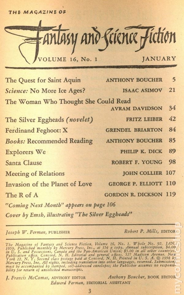 Cover by Ed Emshwiller. "Explorers We" by Philip K. Dick, plus more science fiction and fantasy stories by Anthony Boucher, Isaac Asimov, Avram Davidson, Fritz Leiber, Grendel Briarton, Robert F. Young, John Collier, George P. Elliot and Gordon R. Dickson. Softcover, 5.5-in., black and white (all text) Cover price $0.35.