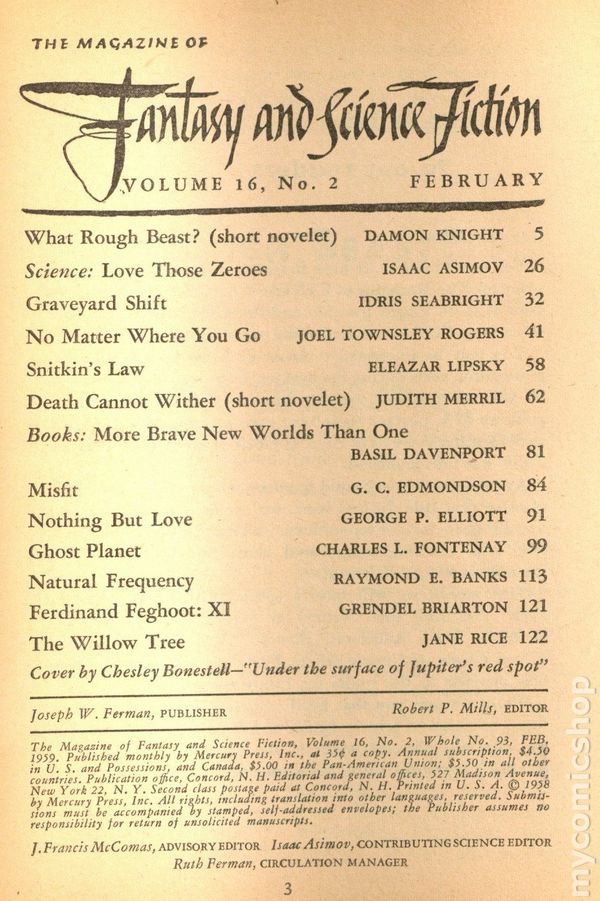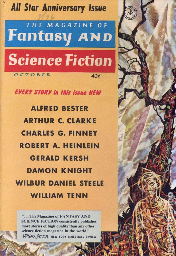 Cover by Kelly Freas. "The Door into Summer" 2/3 by Robert A. Heinlein, plus more fantasy and science fiction stories by Robert F. Young, Gordon R. Dickson, Margaret St. Clair (as Idris Seabright), Issac Asimov, Miriam Allen DeFord, and Theodore R. Cogswell. Softcover, 5 1/2-in. x 7 1/2-in., 128 pages, B&W. Cover price $0.35.