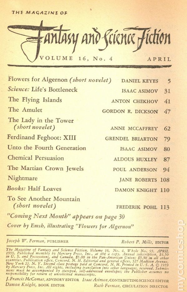 Cover by Ed Emshwiller. "Flowers for Algermon" by Daniel Keys and "The Lady in the Tower" by Anne McCaffrey, plus more fantasy and science fiction stories by Anton Chekhov, Gordon R. Dickson, Grendel Briarton, Isaac Asimov, Aldous Huxley, Poul Anderson, Jane Roberts, Damon Knight and Frederick Pohl. Science article by Isaac Asimov. Softcover. 5.5-in. x 7.5-in. 130 pages, black and white (all text) Cover price $0.40.
