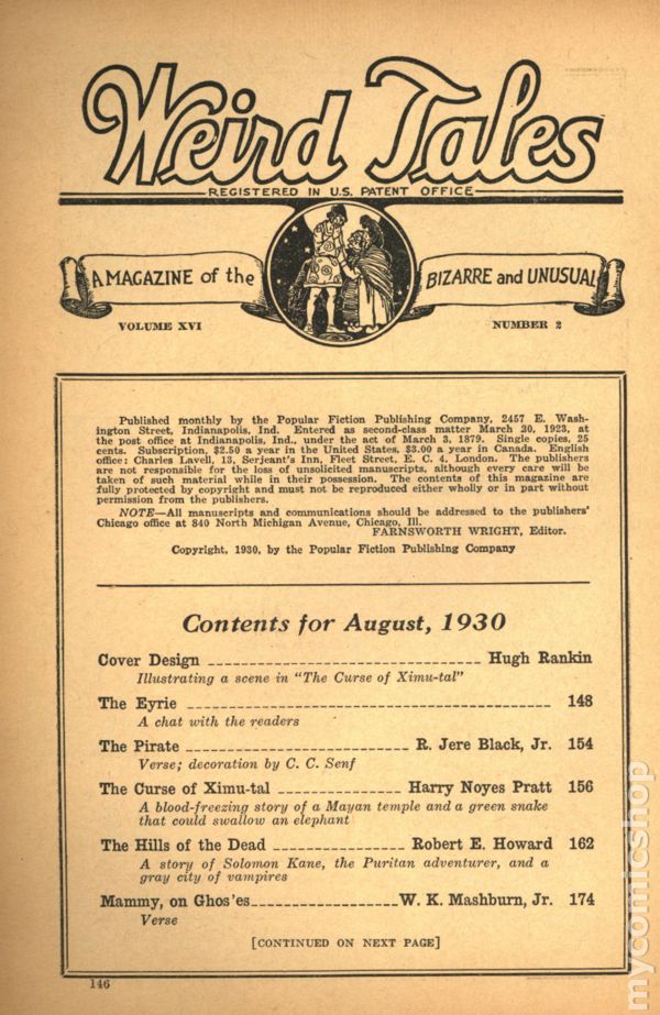 Volume 16, Issue 5 - November, 1930. Edited by Farnsworth Wright. Horror and Fantasy stories in the pulp style. 6.75-in. x 10-in.; 128 newsprint pages, text (with B&W illustrations). First appearance of Robert E. Howard's Bran Mak Morn in Kings of the Night. Cover price $0.25.