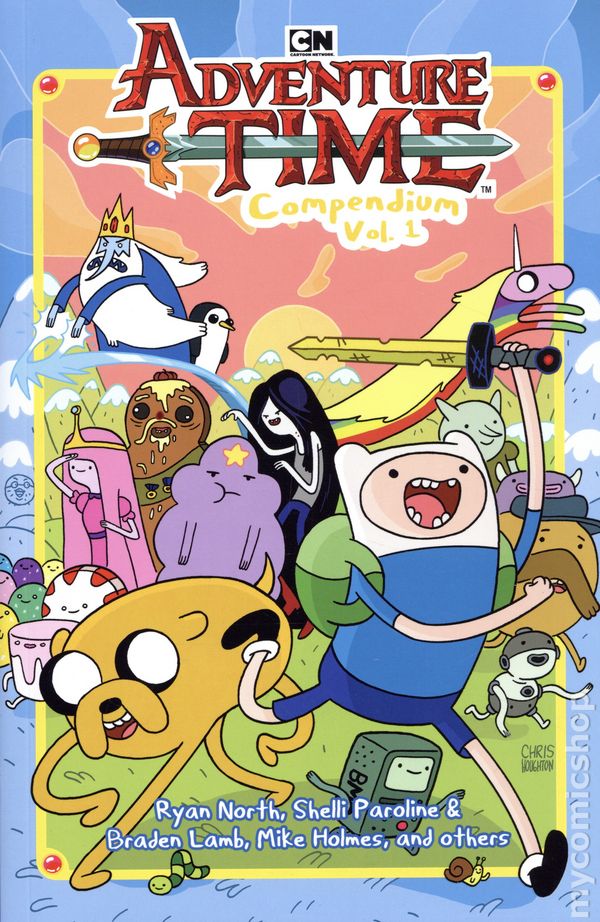 Volume 1 - 2nd and later printings. Collects Adventure Time (2012-2018 Kaboom) #1-35. Written by Ryan North. Art by Shelli Paroline, Braden Lamb, Mike Holmes, Dustin Nguyen, Jess Fink, Jeffrey Brown, Jim Rugg, KatPhilbin, Missy Pena, Becca Tobin, Yumi Sakugawa, Jesse Tise, Ian McGinty, T. Zysk, and David Cutler. Cover by Chris Houghton. C'mon, grab your friends and head to distant lands in this first-of-its-kind complete collection of award-winning writer Ryan North's run on the beloved Adventure Time comics! It's the mathematical and radical adventures of Finn and Jake as they team up with some of Ooo's most memorable residents to do what they do best-PUNCH THINGS! Er, we mean ADVENTURE! With Princess Bubblegum, Marceline the Vampire Queen, Ice King, Lumpy Space Princess, BMO, and more along for the ride, what could possibly go wrong?! First, this motley crew has to defeat the Lich before the unthinkable happens, and the whole of Ooo is flung straight into the sun! And then it's a race to see who can walk in a straight line the longest to become the rightful owner of BMO's famous "cup cake"! And Princess Bubblegum inventing time travel is a good thing, right? It totally won't lead to the flipping ROBOT APOCALYPSE, right?? And then-hey, wait a minute . . . why're we spoiling all the good stuff?! Discover all these tales and more in the first definitive Adventure Time compendium, collecting the landmark run (issues #1-35) from multiple Eisner Award winner Ryan North (Unbeatable Squirrel Girl) with contributions from acclaimed artists Shelli Paroline & Braden Lamb (Midas), Mike Holmes (Wings of Fire), and Jim Rugg (Street Angel), and many more! Softcover, 688 pages, full color. Cover price $49.99.