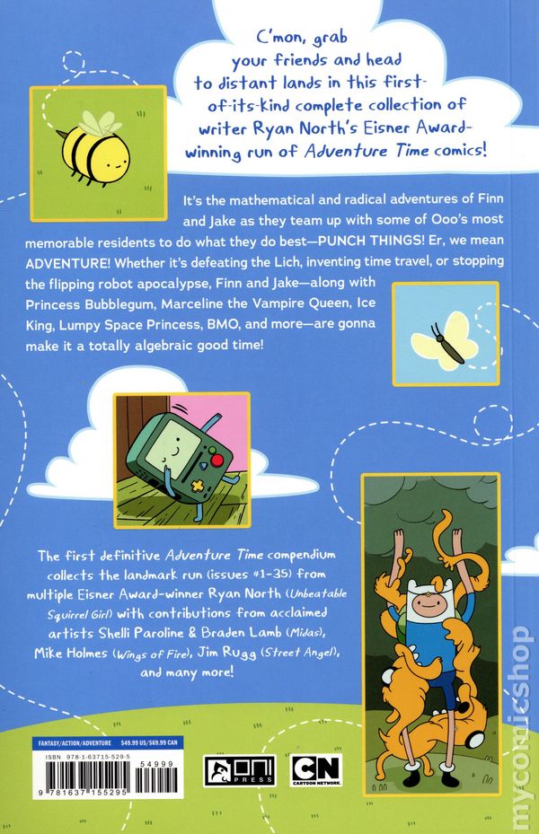 Volume 1 - 1st printing. Collects Adventure Time (2012-2018 Kaboom) #1-35. Written by Ryan North. Art by Shelli Paroline, Braden Lamb, Mike Holmes, Dustin Nguyen, Jess Fink, Jeffrey Brown, Jim Rugg, KatPhilbin, Missy Pena, Becca Tobin, Yumi Sakugawa, Jesse Tise, Ian McGinty, T. Zysk, and David Cutler. Cover by Chris Houghton. C'mon, grab your friends and head to distant lands in this first-of-its-kind complete collection of award-winning writer Ryan North's run on the beloved Adventure Time comics! It's the mathematical and radical adventures of Finn and Jake as they team up with some of Ooo's most memorable residents to do what they do best-PUNCH THINGS! Er, we mean ADVENTURE! With Princess Bubblegum, Marceline the Vampire Queen, Ice King, Lumpy Space Princess, BMO, and more along for the ride, what could possibly go wrong?! First, this motley crew has to defeat the Lich before the unthinkable happens, and the whole of Ooo is flung straight into the sun! And then it's a race to see who can walk in a straight line the longest to become the rightful owner of BMO's famous "cup cake"! And Princess Bubblegum inventing time travel is a good thing, right? It totally won't lead to the flipping ROBOT APOCALYPSE, right?? And then-hey, wait a minute . . . why're we spoiling all the good stuff?! Discover all these tales and more in the first definitive Adventure Time compendium, collecting the landmark run (issues #1-35) from multiple Eisner Award winner Ryan North (Unbeatable Squirrel Girl) with contributions from acclaimed artists Shelli Paroline & Braden Lamb (Midas), Mike Holmes (Wings of Fire), and Jim Rugg (Street Angel), and many more! Softcover, 688 pages, full color. Cover price $49.99.