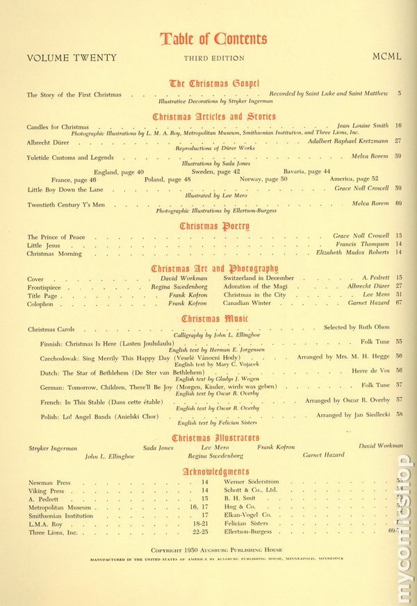 Volume 20, Third Edition. "An American Annual of Christmas Literature & Art." Christmas stories, Scripture, hymns, art (modern and classical), poems, and photography in a deluxe oversize format. Extraordinary production values, including tipped-in plates. 10.5-in. x 13.75-in.; part color; 68 pages. No cover price. Augsburg Publishing House.