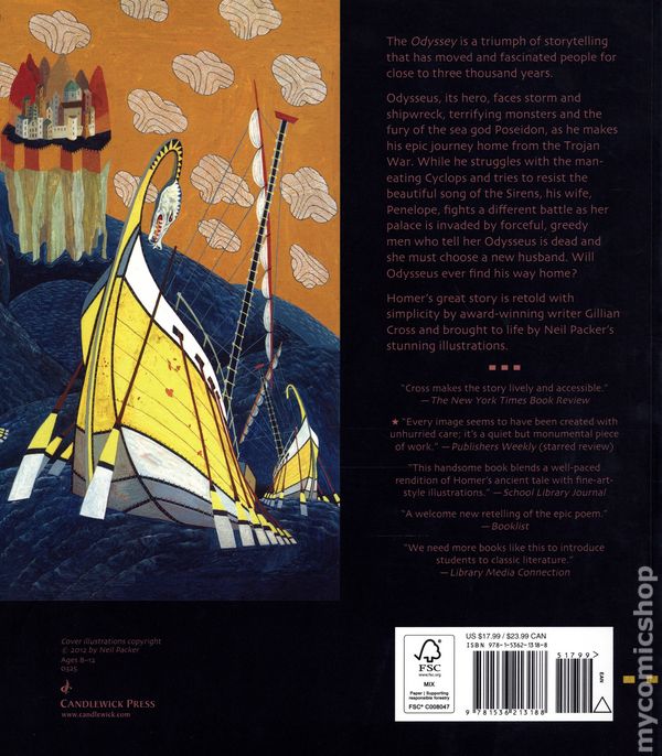 1st printing. Based on the Epic Poem by Homer. Adapted by Gillian Cross. Art and cover by Neil Packer. Odysseus faces storm and shipwreck, a terrifying man-eating Cyclops, the alluring but deadly Sirens, and the fury of the sea-god Poseidon as he makes his ten-year journey home from the Trojan War. And while Odysseus struggles to return to Ithaca, his wife, Penelope, fights a different kind of battle as her palace is invaded by forceful, greedy men who tell her that Odysseus is dead and she must choose a new husband. Will Odysseus reach her in time? Homers epic, age-old story is powerfully told by Carnegie Medalist Gillian Cross and stunningly illustrated by Neil Packer. Softcover, 9-in. x 10 1/4-in., 176 pages, full color. Cover price $17.99.