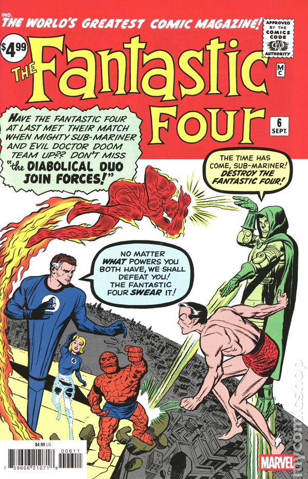 Written by Stan Lee. Art by Jack Kirby. Cover by Jack Kirby. The newly formed Fantastic Four barely withstood their first encounters with each of their powerful enemies, Doctor Doom and the Sub-Mariner. So what happens when Doom and Namor join forces? Find out as the armored tyrant tracks down the Sub-Mariner in his underseas kingdom, inciting him to seek vengeance on the surface world - and its accursed protectors, the Fantastic Four! But when it comes down to battle, just whose side will Namor be on? It's one of the all-time great Marvel comic books, boldly re-presented in its original form, ads and all! Reprinting FANTASTIC FOUR (1961) #6. Marvel is reprinting the first twelve issues of FANTASTIC FOUR as they originally appeared! 32 pages, full color. Rated T+ Cover price $4.99.
