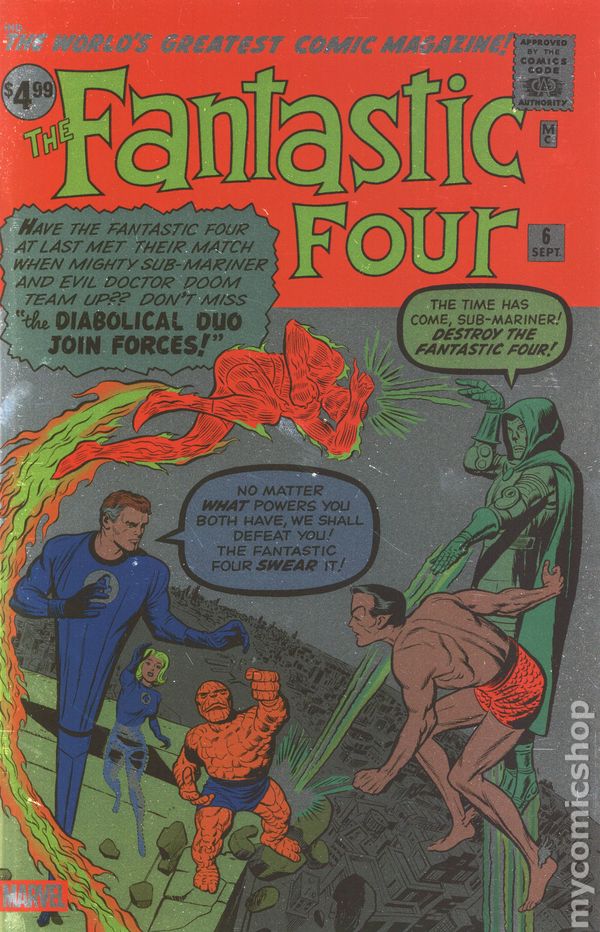 Foil Cover. Written by Stan Lee. Art by Jack Kirby. Cover by Jack Kirby. The newly formed Fantastic Four barely withstood their first encounters with each of their powerful enemies, Doctor Doom and the Sub-Mariner. So what happens when Doom and Namor join forces? Find out as the armored tyrant tracks down the Sub-Mariner in his underseas kingdom, inciting him to seek vengeance on the surface world - and its accursed protectors, the Fantastic Four! But when it comes down to battle, just whose side will Namor be on? It's one of the all-time great Marvel comic books, boldly re-presented in its original form, ads and all! Reprinting FANTASTIC FOUR (1961) #6. Marvel is reprinting the first twelve issues of FANTASTIC FOUR as they originally appeared! 32 pages, full color. Rated T+ Cover price $4.99.