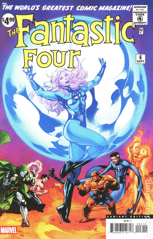 Limited 1 for 25 Retailer Incentive Variant Cover. Written by Stan Lee. Art by Jack Kirby. Cover by Ema Lupacchino. The newly formed Fantastic Four barely withstood their first encounters with each of their powerful enemies, Doctor Doom and the Sub-Mariner. So what happens when Doom and Namor join forces? Find out as the armored tyrant tracks down the Sub-Mariner in his underseas kingdom, inciting him to seek vengeance on the surface world - and its accursed protectors, the Fantastic Four! But when it comes down to battle, just whose side will Namor be on? It's one of the all-time great Marvel comic books, boldly re-presented in its original form, ads and all! Reprinting FANTASTIC FOUR (1961) #6. Marvel is reprinting the first twelve issues of FANTASTIC FOUR as they originally appeared! 32 pages, full color. Rated T+ Cover price $4.99.