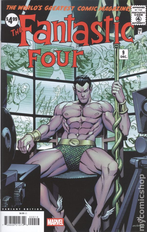 Limited 1 for 25 Retailer Incentive Variant Cover. Written by Stan Lee. Art by Jack Kirby. Cover by Marcus. To Continuing a facsimile collection of the foundational adventures of Marvel's First Family! Disaster strikes as the FF are declared bankrupt, faced with having to sell their skyscraper home and all Reed Richards' remarkable inventions. But salvation arrives in the form of a one-million- dollar offer to head to Hollywood and make a Fantastic Four movie! Who could be the wealthy studio mogul financing the flick? Why, it's their old sparring partner Namor! But has Subby really set his sights on silver-screen success? Or is this all part of some scheme to get revenge on the FF - and to win the heart of his leading lady, Susan Storm? It's one of the all-time great Marvel comic books, boldly re-presented in its original form, ads and all! Reprinting FANTASTIC FOUR (1961) #9. Marvel is reprinting the first twelve issues of FANTASTIC FOUR as they originally appeared! 32 pages, full color. Cover price $4.99.