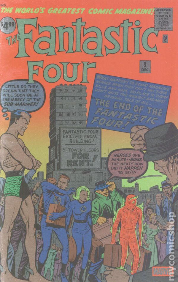 Foil Cover. Written by Stan Lee. Art by Jack Kirby. Cover by Jack Kirby. Continuing a facsimile collection of the foundational adventures of Marvel's First Family! Disaster strikes as the FF are declared bankrupt, faced with having to sell their skyscraper home and all Reed Richards' remarkable inventions. But salvation arrives in the form of a one-million- dollar offer to head to Hollywood and make a Fantastic Four movie! Who could be the wealthy studio mogul financing the flick? Why, it's their old sparring partner Namor! But has Subby really set his sights on silver-screen success? Or is this all part of some scheme to get revenge on the FF - and to win the heart of his leading lady, Susan Storm? It's one of the all-time great Marvel comic books, boldly re-presented in its original form, ads and all! Reprinting FANTASTIC FOUR (1961) #9. Marvel is reprinting the first twelve issues of FANTASTIC FOUR as they originally appeared! 32 pages, full color. Cover price $4.99.