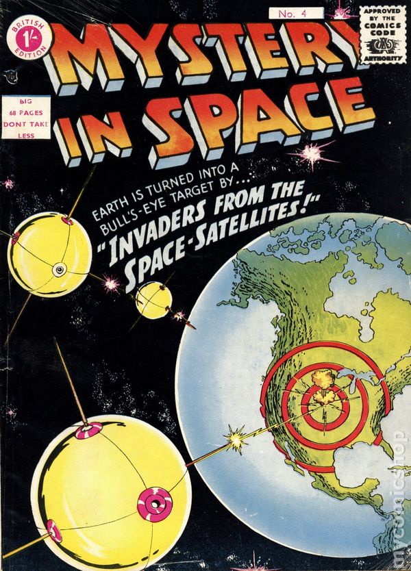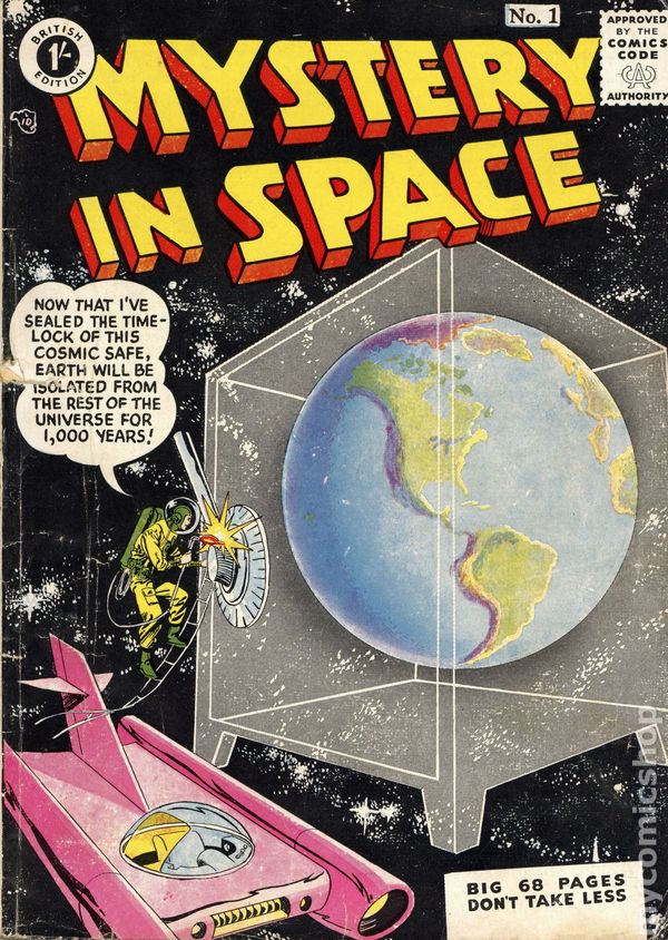 UK reprint of Mystery in Space (1951 DC) #24 in B&W. "The Hitchhiker of Space," "The Planet That Imitated Earth," "The Unearthly Earthman" (pencils by Gil Kane), and "Duel in the Stars" (art by Carmine Infantino). Full-page ad for My Greatest Adventure 1. Murphy Anderson cover.