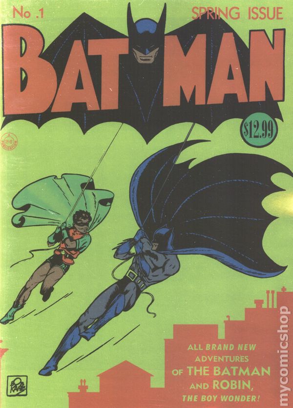 Foil Cover. Written by Bill Finger. Art by Bob Kane, Jerry Robinson. Cover by Bob Kane. THE ISSUE THAT CHANGED THE WORLD! From the pages of Detective Comics--the Dark Knight in his own book at last! Learn who he is and how he came to be! See the first appearances of the villainous Joker--and the thrilling thief who will come to be known as Catwoman! All this and the preternatural perils of Professor Hugo Strange! 64 pages, full color. Cover price $12.99.