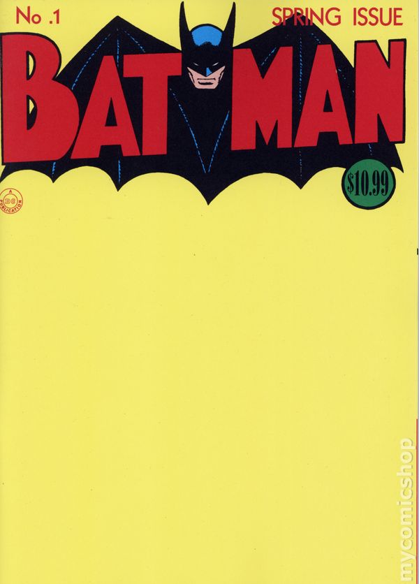 Written by Bill Finger. Art by Bob Kane, Jerry Robinson. Blank Cover. THE ISSUE THAT CHANGED THE WORLD! From the pages of Detective Comics--the Dark Knight in his own book at last! Learn who he is and how he came to be! See the first appearances of the villainous Joker--and the thrilling thief who will come to be known as Catwoman! All this and the preternatural perils of Professor Hugo Strange! 68 pages, full color. Cover price $10.99.