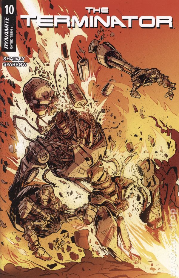 Written by Declan Shalvey. Art by Luke Sparrow. Cover by David Cousens. SYSTEM OVERLOAD! In the terrible aftermath of Judgement Day, the scattered survivors of Skynet's nuclear holocaust slowly emerged from the wreckage, banding together in a desperate bid for survival. As their numbers grew, they learned how to evade the relentless machines - and eventually, how to fight back against them. Soon, an organized resistance movement rose out of the ashes, and bit by bit the shattered remnants of humanity began to take back their world. At the center of it all was one man - a familiar face whose past turned out to hold the key to the future! Master programmers DECLAN SHALVEY and LUKE SPARROW wrap up their second story arc in appropriately apocalyptic style with The Terminator #10 - featuring algorithmically optimized covers by SHALVEY, EDWIN GALMON, CAT STAGGS, and DAVID COUSENS! 32 pages, full color. Rated T+ Cover price $4.99.