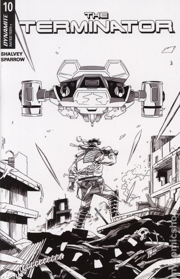 Limited 1 for 20 Retailer Incentive Variant Cover. Written by Declan Shalvey. Art by Luke Sparrow. Cover by Declan Shalvey. SYSTEM OVERLOAD! In the terrible aftermath of Judgement Day, the scattered survivors of Skynet's nuclear holocaust slowly emerged from the wreckage, banding together in a desperate bid for survival. As their numbers grew, they learned how to evade the relentless machines - and eventually, how to fight back against them. Soon, an organized resistance movement rose out of the ashes, and bit by bit the shattered remnants of humanity began to take back their world. At the center of it all was one man - a familiar face whose past turned out to hold the key to the future! Master programmers DECLAN SHALVEY and LUKE SPARROW wrap up their second story arc in appropriately apocalyptic style with The Terminator #10 - featuring algorithmically optimized covers by SHALVEY, EDWIN GALMON, CAT STAGGS, and DAVID COUSENS! 32 pages, full color. Rated T+ Cover price $4.99.