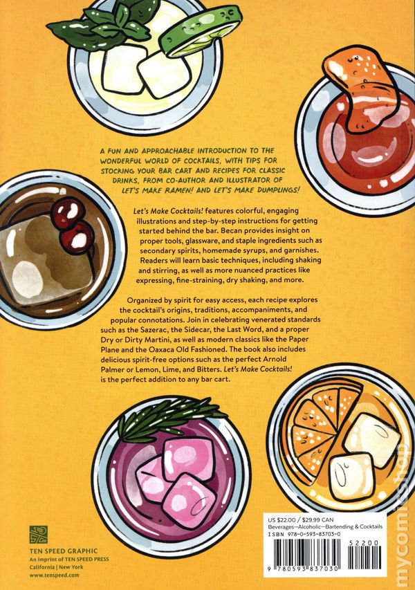 1st printing. By Sarah Becan. A fun and approachable comic book introduction to the wonderful world of cocktails, with tips for stocking your home bar and 60 recipes for classic drinks, from the co-author and illustrator of Let's Make Ramen! and Let's Make Dumplings! Sarah Becan invites readers to wet their whistles in Let's Make Cocktails! Featuring her colorful, engaging illustrations that have become a series favorite, the book opens with insight on the proper tools, glassware, and staple ingredients such as juices, sodas, homemade syrups, and garnishes to always have in stock. With vivid, easy-to-follow graphics, Becan guides readers through basic techniques such as shaking, stirring, muddling, and more. The book explores the origins, traditions, and popular legends surrounding foundational cocktails, including fun tidbits on drink accompaniments and occasions. Softcover, 192 pages, full color. Cover price $22.00.