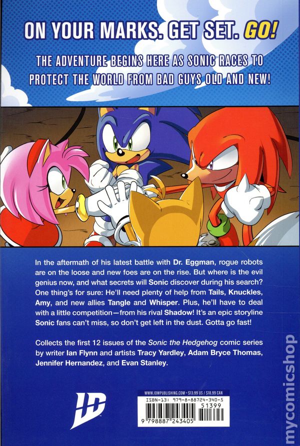 Volume 1 - 1st printing. Collects Sonic The Hedgehog TPB (2018- IDW) Vol. 1-3. Written by Ian Flynn. Art by Tracy Yardley, Jim Amash, Bob Smith, Adam Bryce Thomas, Jennifer Hernandez, and Evan Stanley. Cover by Tracy Yardley. Back Cover by Adam Bryce Thomas. ON YOUR MARKS. GET SET. GO! The adventure begins here as Sonic races to protect the world from bad guys old and new! In the aftermath of his latest battle with Dr. Eggman, rogue robots are on the loose and new foes are on the rise. But where is the evil doctor and what secrets will Sonic discover during his search? One thing's for sure: he'll need plenty of help from Tails, Knuckles, Amy, and new allies Tangle the Lemur and Whisper the Wolf. Plus, he'll have to deal with a little competition--from his old frenemy Shadow the Hedgehog! It's an epic storyline Sonic fans can't miss, so don't get left in the dust. Gotta go fast! Softcover, 6-in. x 9-in., 288 pages, full color. Cover price $13.99.