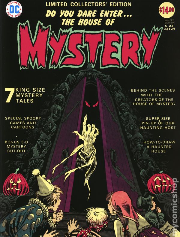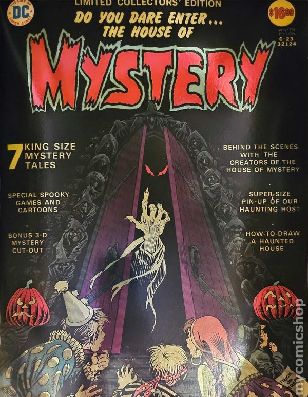 (W) Various (A) Various (CA) Nick Cardy ENTER THE HOUSE OF MYSTERY! Wrtten by Sergio Aragones, Robert Kanigher, Howie Post, Mike Friedrich, Jack Oleck and Steve Keates Art by Sergio Aragones, Jack Sparling, Bernie Wrightson, Neal Adams, Gil Kane and Alex Toth There are nearly as many weary souls whove taken rooms at the House of Mystery as there are reasons for them to seek its sullen sanctuary, and its humble caretaker is always happy to accommodate. Join Cain as he welcomes a certain haunted sculptor on the run from his own creations, a dangerous sorcerer whose treasured pet cat is far more than it seems--and even comics legend Gil Kane as the artist truly throws himself into his work! Full Color, 80 pages, Not Rated, FOIL. Cover price $16.99.