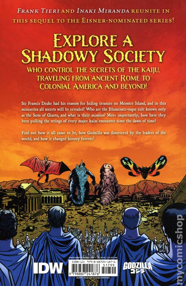 Written by Frank Tieri. Art by Inaki Miranda. Cover by Inaki Miranda. Hiding in the shadows of history, there is an Illuminati-esque cult that has been pulling the strings of every major kaiju encounter. In this issue, their identities are finally revealed.Also revealed for the first time is the story of Smog Monsters earliest encounter with humans, and its first meeting with Godzilla in ancient Rome. 28 pages, full color. Cover price $4.99.