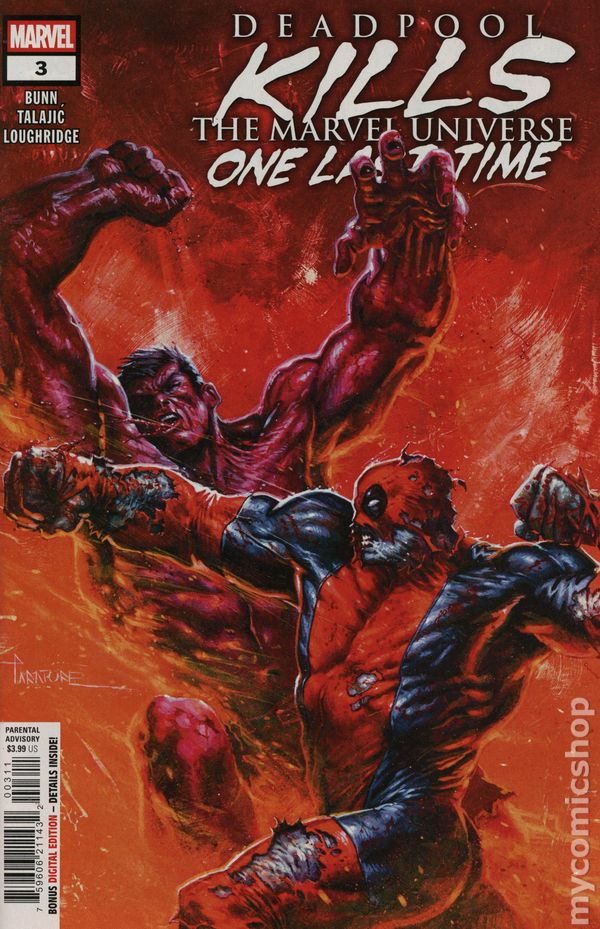 Limited 1 for 25 Retailer Incentive Variant Cover. Written by Cullen Bunn. Art by Dalibor Talajic. Cover by Nick Bradshaw. THE TRILOGY CONCLUDES! First, Deadpool killed every hero in the Marvel Universe… Then he killed every hero in another Marvel Universe… Well, now, hes back, and this time, slaughtering his way through Earths Mightiest Heroes wont be enough! Hes going after the worst of the worst, a whole Multiverse of Marvels greatest gone bad. Get ready for world-breaking Hulks, werewolf Captain Americas, and some all-new twisted takes! The classic universe-slaughtering team of Cullen Bunn (DEADPOOL KILLS THE MARVEL UNIVERSE) and Dalibor Talajić (DEADPOOL KILLS THE MARVEL UNIVERSE AGAIN) reunite to kill everyone one…more…time! 32 pages, full color. Rated Parental Advisory Cover price $4.99.