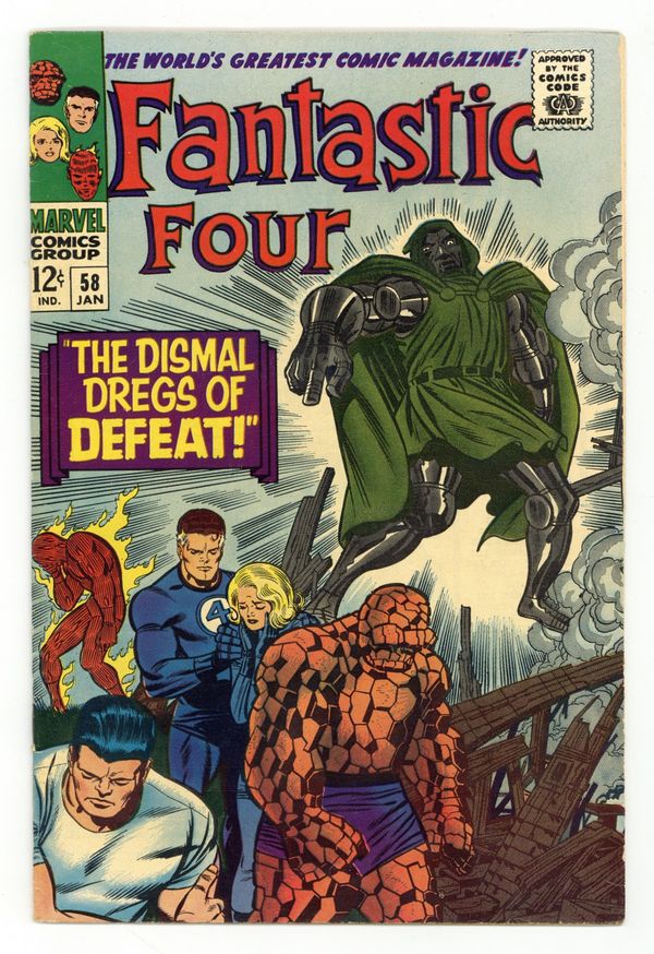 Ends Feb 23 8:04 PM CST Bid History 6 bids Current Bid $49 Your Secret Max Bid If you'd like to bid, please log in or register. Cover pencils by Jack Kirby, inks by Joe Sinnott. The Dismal Dregs of Defeat!, script by Stan Lee and Jack Kirby (co-plot), pencils by Jack Kirby, inks by Joe Sinnott; Dr. Doom attacks and defeats the FF; he also steals the Silver Surfer's cosmic powers (part 2 of 4). Lockjaw (of the Inhumans) appearance. 36 pgs. $0.12. Cover price $0.12.