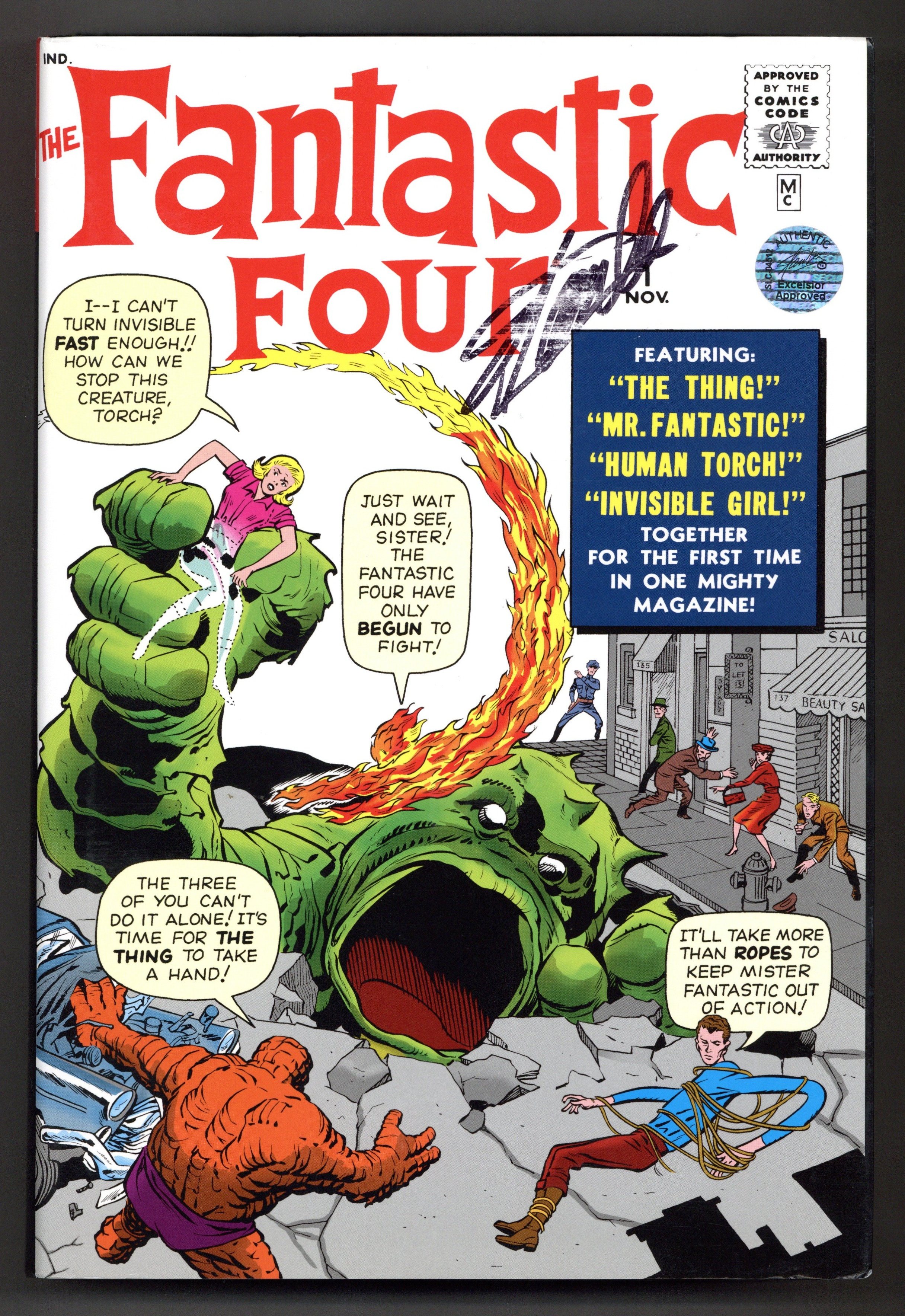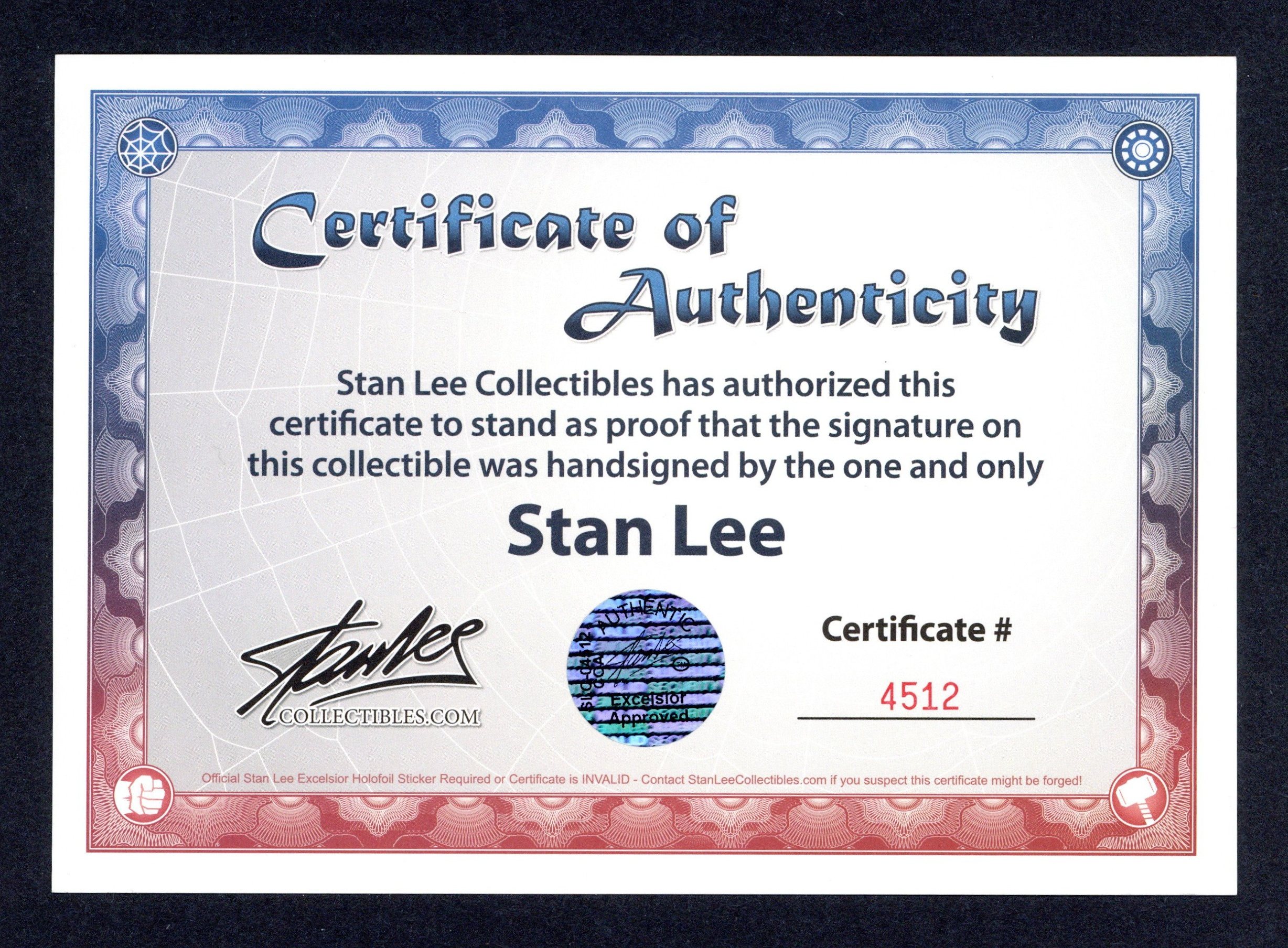 Dust jacket signed by writer Stan Lee, includes Certificate of Authenticity and holographic sticker from Stan Lee Collectibles. Autograph is damaged/faded.