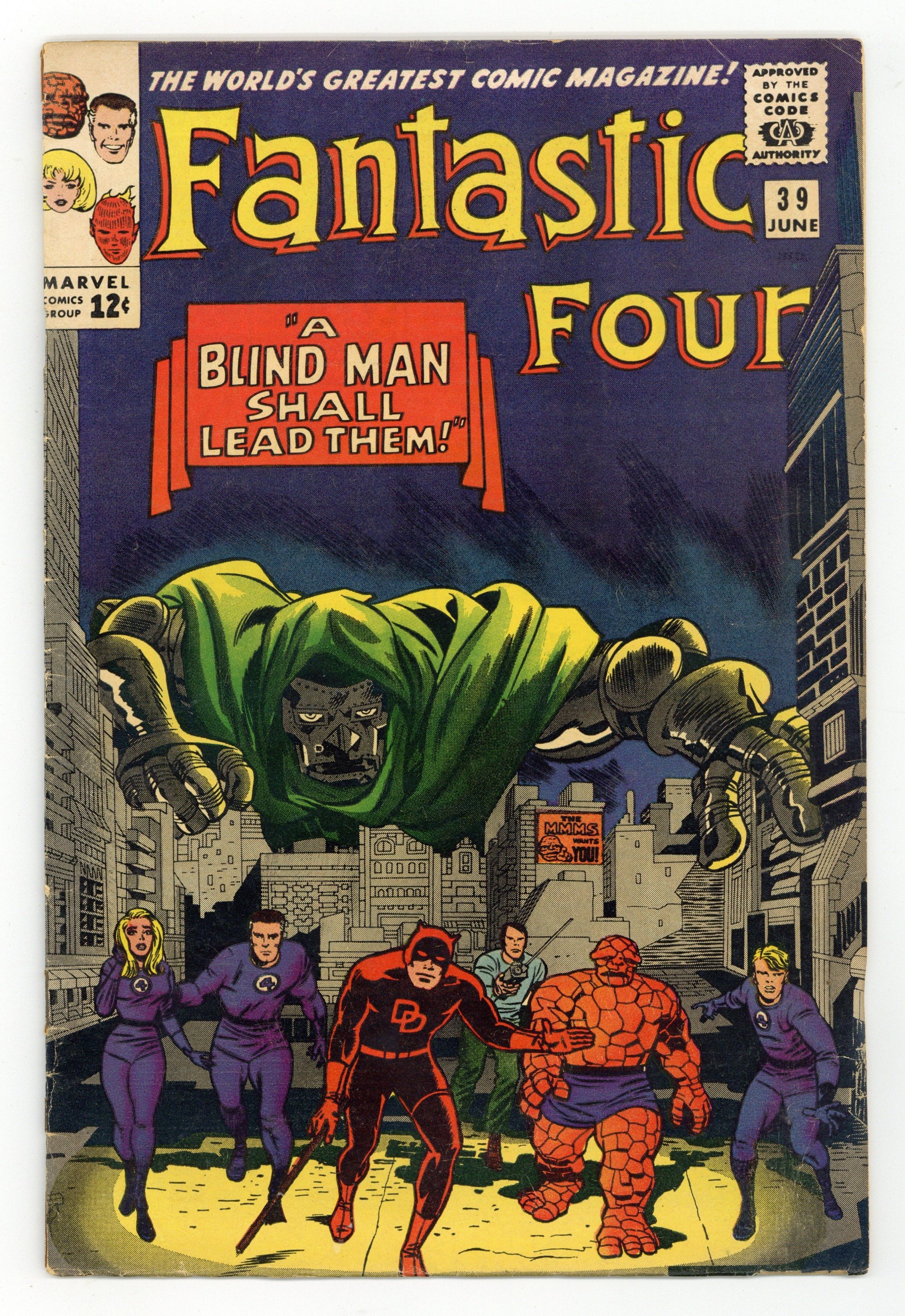 Ends Feb 23 8:04 PM CST Bid History 5 bids Current Bid $11 Your Secret Max Bid If you'd like to bid, please log in or register. Cover pencils by Jack Kirby, inks by Chic Stone and Wally Wood (on Daredevil figure). A Blind Man Shall Lead Them!, script by Stan Lee, pencils by Jack Kirby, inks by Frank Giacoia [as Frank Ray] and Wally Wood (Matt Murdock and Daredevil figures); Reed devises mechanical devices to enable the FF to duplicate their vanished super-powers; Matt Murdoch visits the FF and Dr. Doom attacks; Daredevil assists the FF in battling Doom. Cameos by Medusa, the Wizard, the Sandman, and the Trapster. 36 pgs. $0.12. Cover price $0.12.
