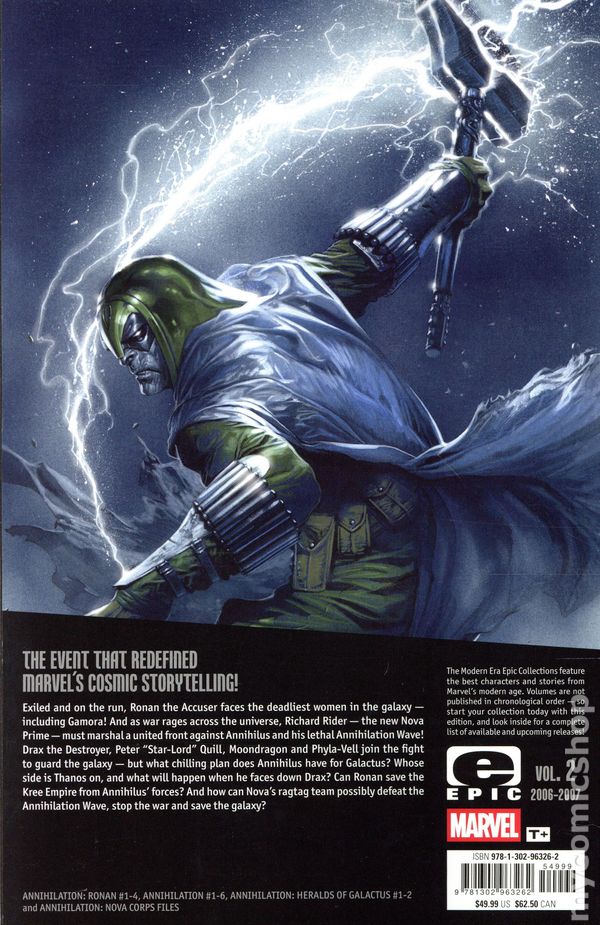 2nd Edition - 1st printing. Collects Drax the Destroyer (2005) #1-4, Annihilation: Prologue (2006), Annihilation: Nova (2006) #1-4, Annihilation: Silver Surfer (2006) #1-4, Annihilation: Super Skrull (2006) #1-4, and Annihilation: Ronan (2006) #1-4, Annihilation (2006) #1-6, Annihilation: Heralds of Galactus (2007) #1-2 and the Annihilation: The Nova Corp Files (2006).