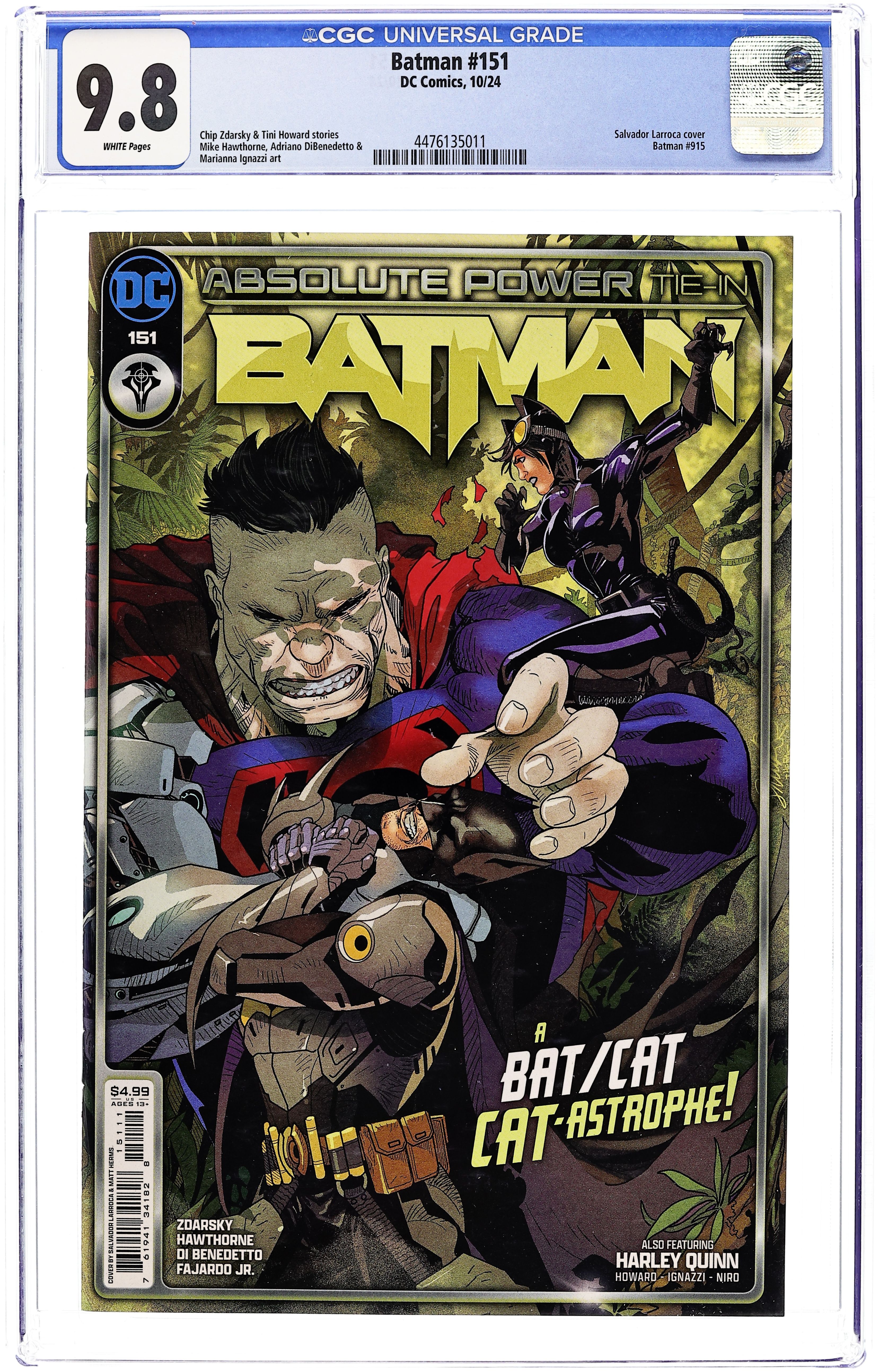 Starts Apr 4 Written by Chip Zdarsky, Tini Howard. Art by Mike Hawthorne, Marianna Ignazzi. Cover by Salvador Larroca. ABSOLUTE POWER TIE-IN! A device critical to Amanda Waller's plans is hidden on a remote, highly protected island. Batman can get there, but only one burglar has a chance of stealing the device and getting it off the island safely. But the device isn't what they expect, and getting off the island turns out to be the least of their problems! Plus: a backup story reveals the chaos unleashed in Gotham City when Arkham is unlocked and the Bat-family are nowhere to be found. 36 pages, full color. Rated T+ Cover price $4.99.