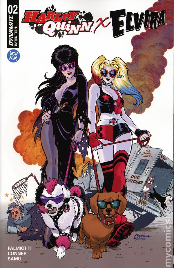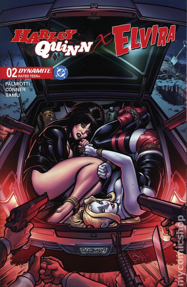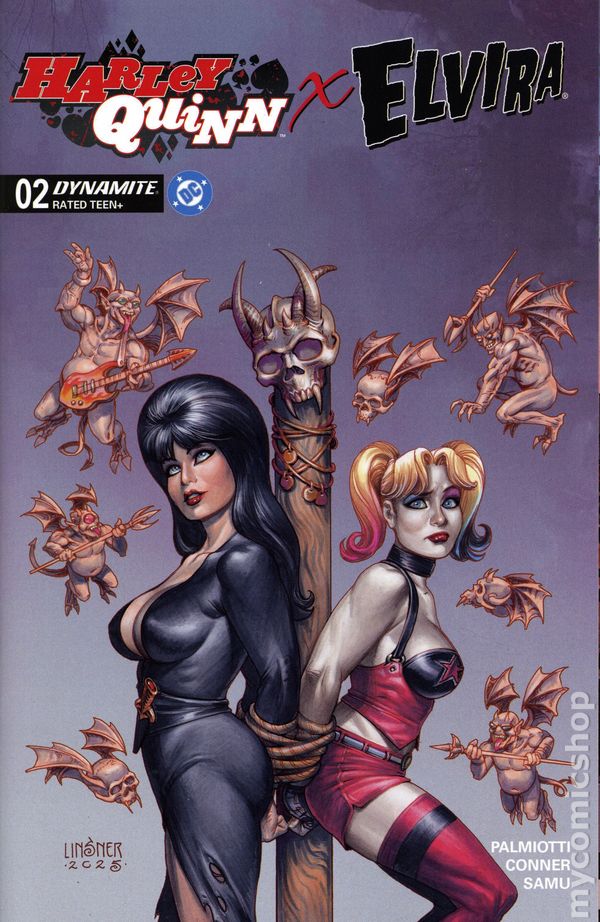 (W) Amanda Conner, Jimmy Palmiotti (A) Amanda Conner, Juan Samu (CA) Joseph Michael Linsner When Elvira first met Harley Quinn, the Mistress of the Dark was desperate for any plan that could help her save her beloved TV show after it was threatened with cancellation by heartless corporate raiders. Well, the Clown Princess of Crime came up with a plan, all right, and now Elvira is along for the ride no matter how crazy Harley's scheme turns out to be! Putting together the biggest Halloween block party ever staged is a great idea in theory, but pulling it off means raising a massive amount of money and a pile of cash that big is sure to draw the attention of every thug and delinquent in the Tri-State area. If Harley and Elvira want to keep their party funds secure, they're going to have to become too big to fail and that means going international! Famed Harley Quinn Whisperers AMANDA CONNER and JIMMY PALMIOTTI double down on the year's most hotly anticipated crossover in Harley Quinn X Elvira #2, with Conner providing two captivating covers as well as several story pages to accompany artist JUAN SAMU's interiors-all capped off by indecently alluring covers from JOSEPH MICHAEL LINSNER, CHAD HARDIN, and BEN CALDWELL! 32 pages, full color, rated teen+. Cover price $4.99.