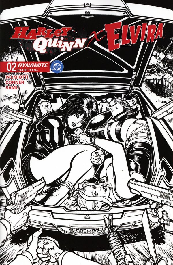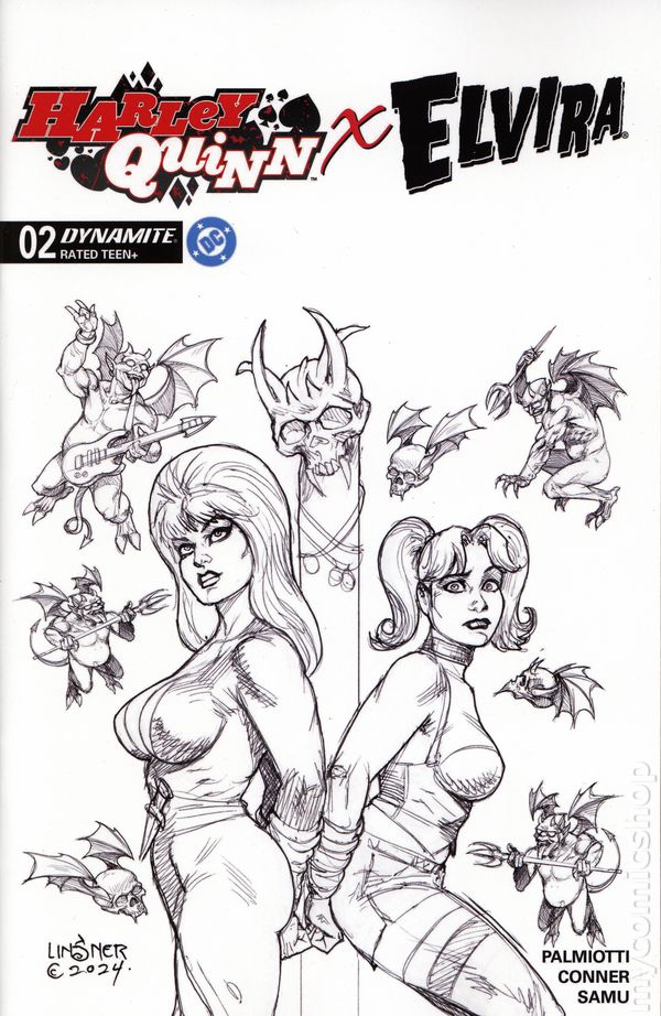 (W) Amanda Conner, Jimmy Palmiotti (A) Amanda Conner, Juan Samu (CA) Blank Sketch THE MISTRESS OF THE DARK MEETS DADDY'S LITTLE MONSTER! What happens when the Clown Princess of Crime gets bored? Shenanigans, hijinks, grievous bodily harm… the possibilities are endless! Now add in a certain macabre-minded TV host who seems to attract trouble like crypts attract vampires, and the stage is set for the greatest team-up since Frankenstein met his Bride! With her beloved show on the chopping block following a corporate takeover, Elvira needs to come up with a plan to get things back in the black - and her new friend Harley Quinn has an idea that's just crazy enough to work! Together, they're going to throw the greatest Halloween party Brooklyn has ever seen - whether the borough likes it or not! Written by AMANDA CONNER and JIMMY PALMIOTTI - the world-famous tag-team of all things Harley Quinn - this crossover event for the ages from Dynamite and DC Comics also showcases Amanda's fan-favorite artistic chops, with each issue featuring two (count 'em, two) Conner covers. And that's not all (certainly not!) - she's also joining interior artist (and Elvira favorite) JUAN SAMU to provide selected story pages for the series! But wait, there's more! This premier issue also includes darkly captivating covers from JOSEPH MICHAEL LINSNER, CHAD HARDIN, BEN CALDWELL, and best-selling Mark Spears Monsters creator MARK SPEARS! 32 pages, full color, rated teen+. Cover price $4.99.