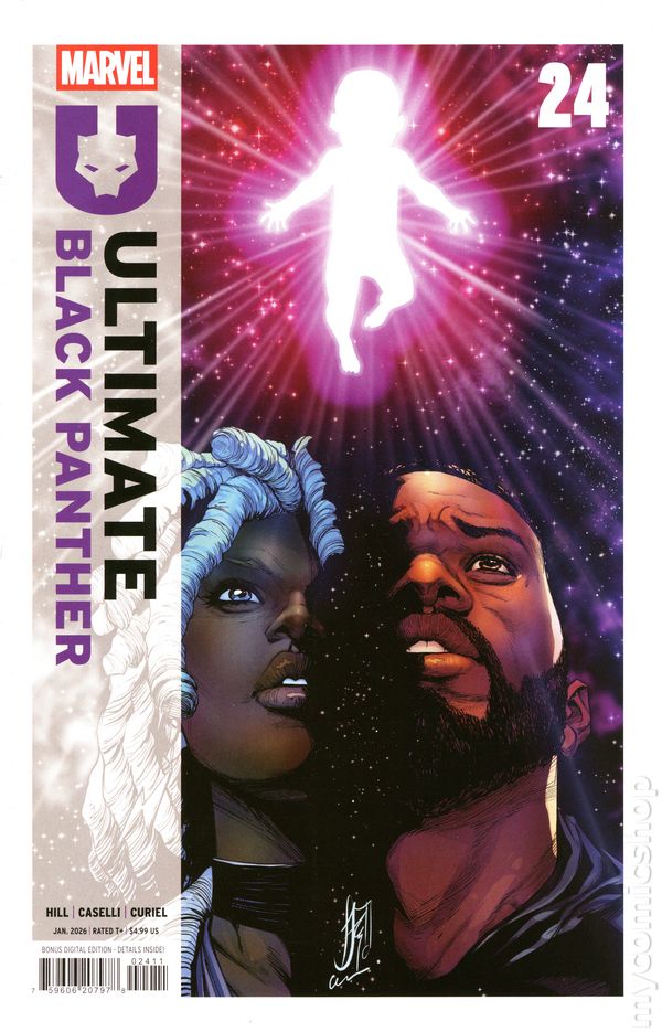 Written by Bryan Hill. Art by Stefano Caselli. Cover by Stefano Caselli. ULTIMATE BLACK PANTHER: YEAR TWO STARTS HERE! With MOON KNIGHT defeated and the Maker's Council forced to regroup, T'Challa must learn the secrets of vibranium - because his very life and soul are at risk! The SORCERER SUPREME can help understand the truth of the terrifying element that built Wakanda, but her aid comes with a price... 32 pages, full color. Rated T+ Cover price $4.99.