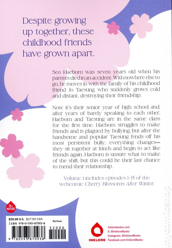 Volume 1 - 1st printing. Story and art by Bamwoo. Despite growing up together, these childhood friends have grown apart. The fan-favorite boys love manhwa turned K-drama comes to print for the first time. Seo Haebom was seven years old when his parents died in an accident. With nowhere else to go, he moves in with the family of his childhood friend Jo Taesung, who suddenly grows cold anddistant, destroying their friendship. Now its their senior year of high school and, after years of barely speaking to each other, Haebom and Taesung are in the same class for the first time. Haebom struggles to make friends and is plagued by bullying, but after the handsome and popular Taesung fends off his most persistent bully, everything changes—they sit together at lunch and begin to act like friends again. Haebom is unsure what to make of the shift, but this could be his last chance to mend their relationship. Volume 1 includes episodes 1-15 of the webcomic Cherry Blossoms After Winter. Softcover, 6-in. x 8 1/2-in., 208 pages, full color. Age 18 and up Cover price $20.00.