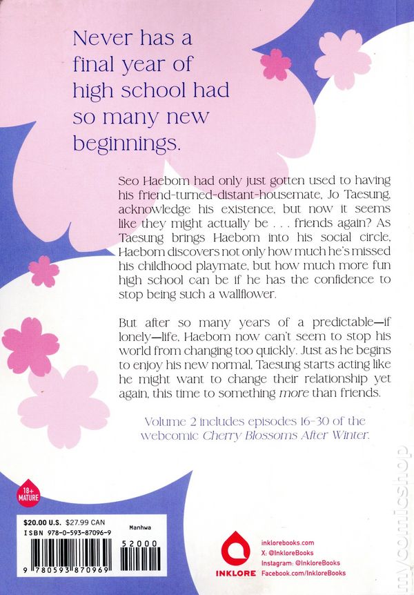 Volume 2 - 1st printing. Story and art by Bamwoo. Never has a final year of high school had so many new beginnings. The second volume of the fan-favorite BL manhwa turned K-drama, now in print for the first time. Seo Haebom had only just gotten used to having his friend-turned-distant-housemate, Jo Taesung, acknowledge his existence, but now it seems like they might actually be...friends again? As Taesung brings Haebom into his social circle, Haebom discovers not only how much hes missed his childhood playmate, but how much more fun high school can be if he has the confidence to stop being such a wallflower. But after so many years of a predictable—if lonely—life, Haebom now cant seem to stop his world from changing too quickly. Just as he begins to enjoy his new normal, Taesung starts acting like he might want to change their relationship yet again, this time to something more than friends. Volume 2 includes episodes 16-30 of the webcomic Cherry Blossoms After Winter. Softcover, 6-in. x 8 1/2-in., 208 pages, full color. Age 18 and up Cover price $20.00.