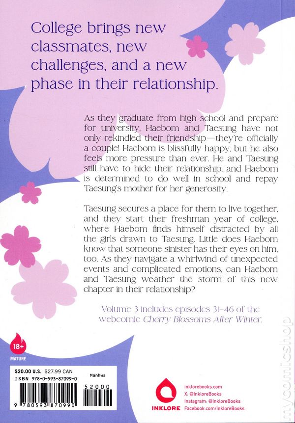 Volume 3 - 1st printing. Story and art by Bamwoo. College brings new classmates, new challenges, and a new phase in their relationship. The third volume of the fan-favorite BL manhwa turned K-drama, now in print for the first time. As they graduate from high school and prepare for university, Haebom and Taesung have not only rekindled their friendship—they're officially a couple! Haebom is blissfully happy, but he also feels more pressure than ever. He and Taesung still have to hide their relationship, and Haebom is determined to do well in school and repay Taesungs mother for her generosity. Taesung secures a place for them to live together, and they start their freshman year of college, where Haebom finds himself distracted by all the girls drawn to Taesung. Little does Haebom know that someone sinister has their eyes on him, too. As they navigate a whirlwind of unexpected events and complicated emotions, can Haebom and Taesung weather the storm of this new chapter in their relationship? Volume 3 includes episodes 31-46 of the webcomic Cherry Blossoms After Winter. Softcover, 6-in. x 8 1/2-in., 240 pages, full color. Age 18 and up Cover price $20.00.