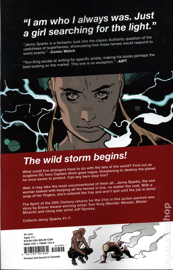 1st printing. Collects Jenny Sparks (2024 DC) #1-7. Written by Tom King. Art and cover by Jeff Spokes. The wild storm begins! What could five strangers have to do with the fate of the world? Find out as Captain Atom goes rogue, threatening to destroy the planet he once swore to protect. Can any hero stop him? Well, it may take the most unconventional of them all...Jenny Sparks, the one woman tasked with keeping ALL the heroes in line, no matter the cost. The Spirit of the 20th Century returns for the 21st in this action-packed trade by Eisner Award-winning writer Tom King (Wonder Woman, Supergirl: Woman of Tomorrow) and artist Jeff Spokes! Softcover, 216 pages, full color. Age 17+ Cover price $19.99.