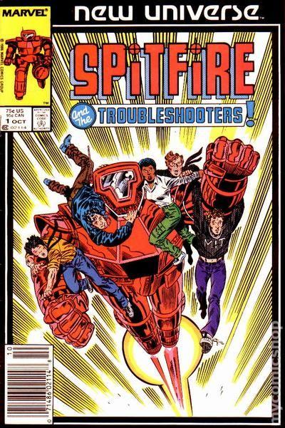 Newsstand Edition. "Beginnings!" Story by Eliot Brow, John Morelli, and Gerry Conway. Art by Herb Trimpe, Joe Sinnott, and Morgan. Words like paranormal or super-hero are euphemisms only used in comic books and movies. That was until the White Event! In one blinding moment the landscape of the universe changed. Welcome to the New Universe. Dr. Swensen is a brilliant man who has just created the most sophisticated weapon in the history of mankind - the M.A.X. (Man Amplified X-periment), the Spitfire battle armor. It's an achievement that will cost him his life. Now it falls to his daughter, Jenny, and her eclectic group of friends known as the Troubleshooters to see that Swensen's life's work doesn't fall into the wrong hands. NOTE: Spitfire and the Troubleshooter's story continues in Star Brand (1986) #2. Cover price $0.75.