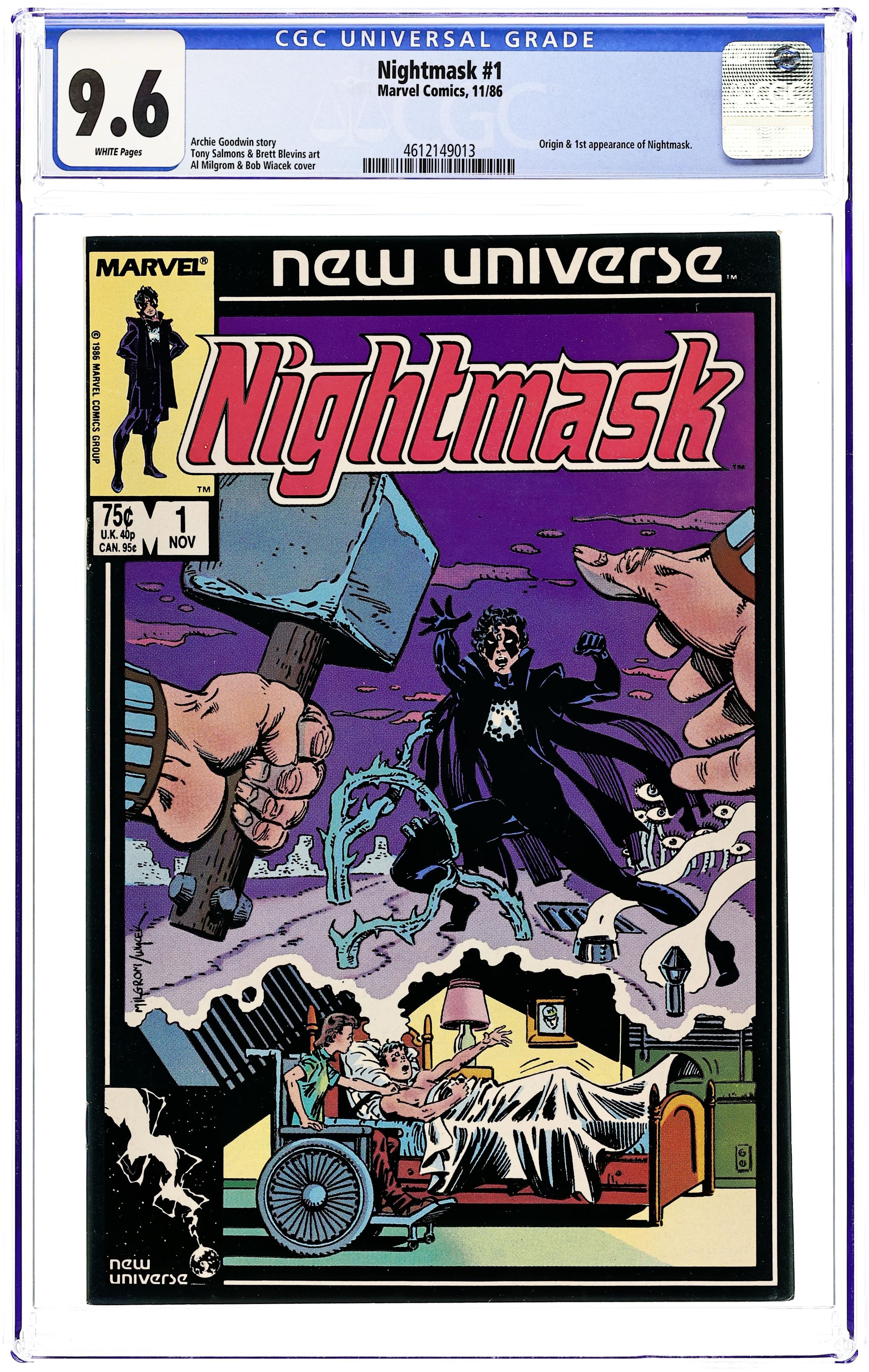 Direct Edition. "The Awakening!" Story by Archie Goodwin. Art by Tony Salmons and Bret Blevins. Words like paranormal or super-hero are euphemisms only used in comic books and movies. That was until the White Event! In one blinding moment the landscape of the universe changed. Welcome to the New Universe. A young man lies in a coma. Then suddenly, in the aftermath of the "White Event," he awakens. But he is forever changed. He suddenly realizes he has the amazing ability to enter people's dreams. Now as the Nightmask, he will use his powers to help those in need. Cover price $0.75.