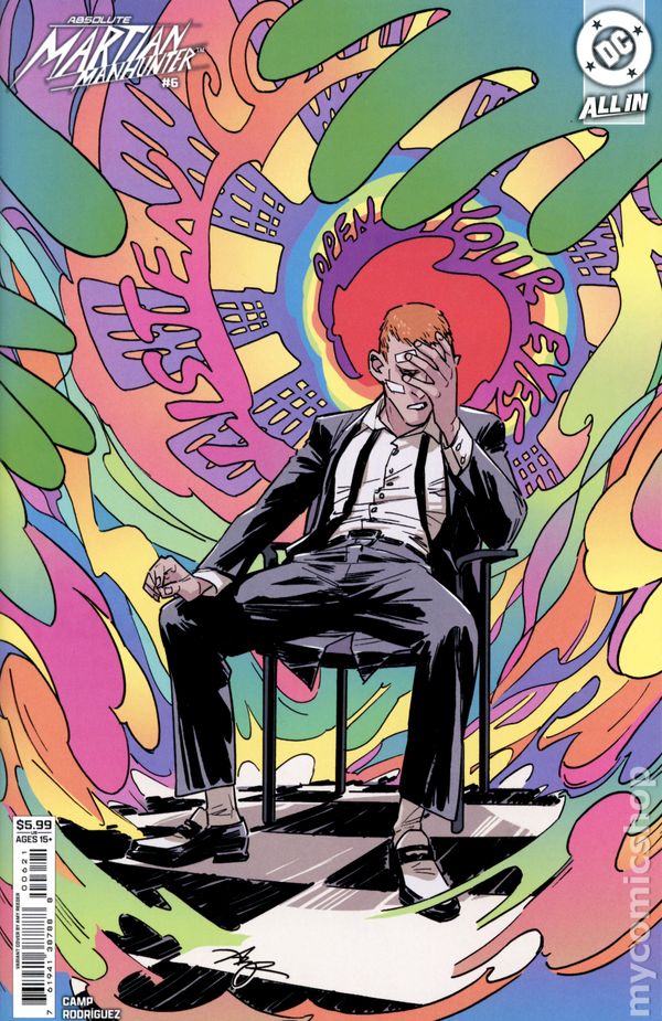Limited 1 for 50 Retailer Incentive Variant Cover. Written by Deniz Camp. Art by Javier Rodriguez. Cover by Mark Chiarello. THE MARTIAN MARCHES INTO MADNESS! Ideas explode like atom bombs, minds melt, and colors clash in the darkness behind the eyes of every person on the planet. It's Green Martian versus White Martian, John Jones versus madness itself, as he fights to save his family--and the world. 32 pages, full color. Rated T+ Cover price $5.99.