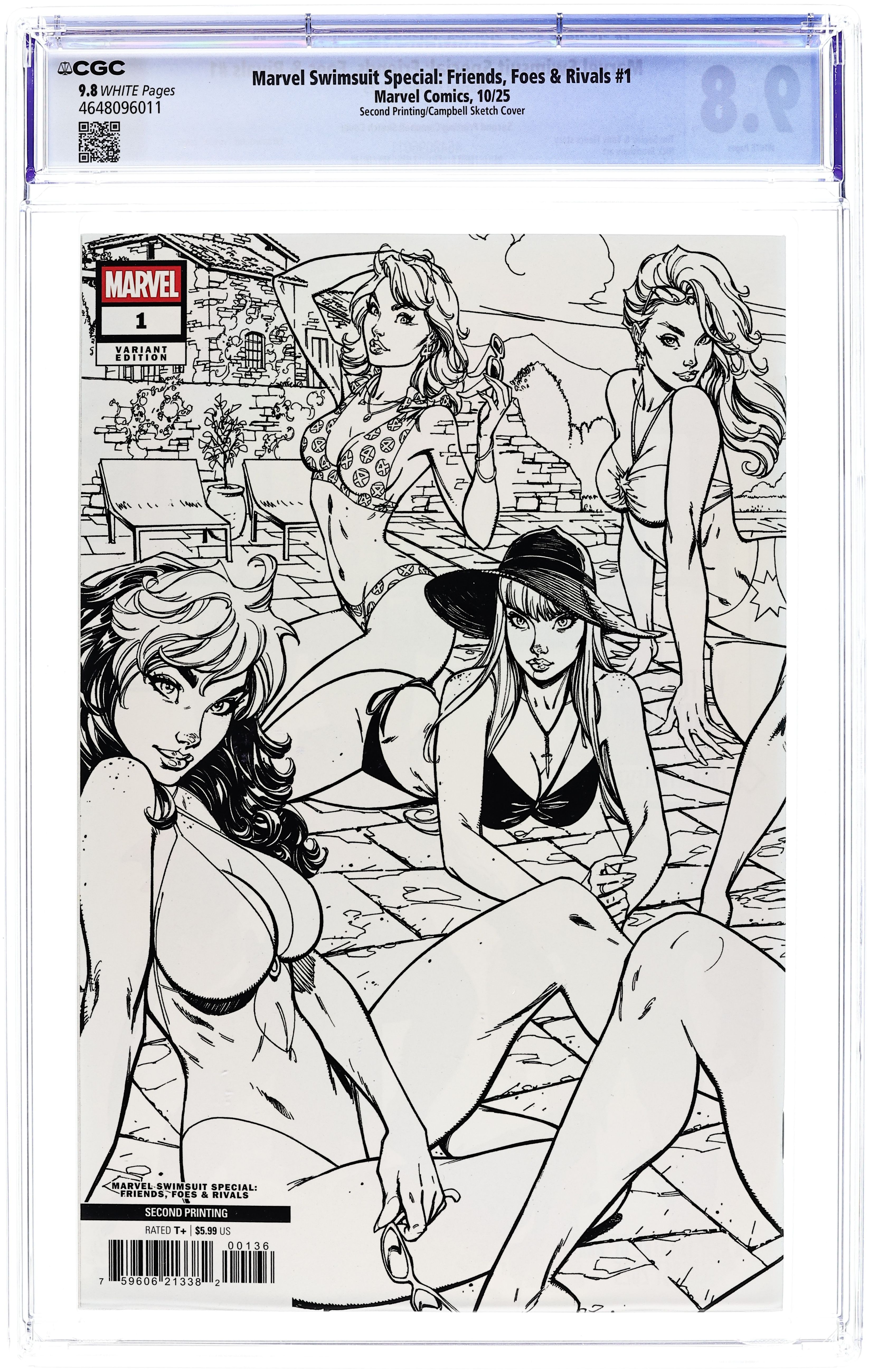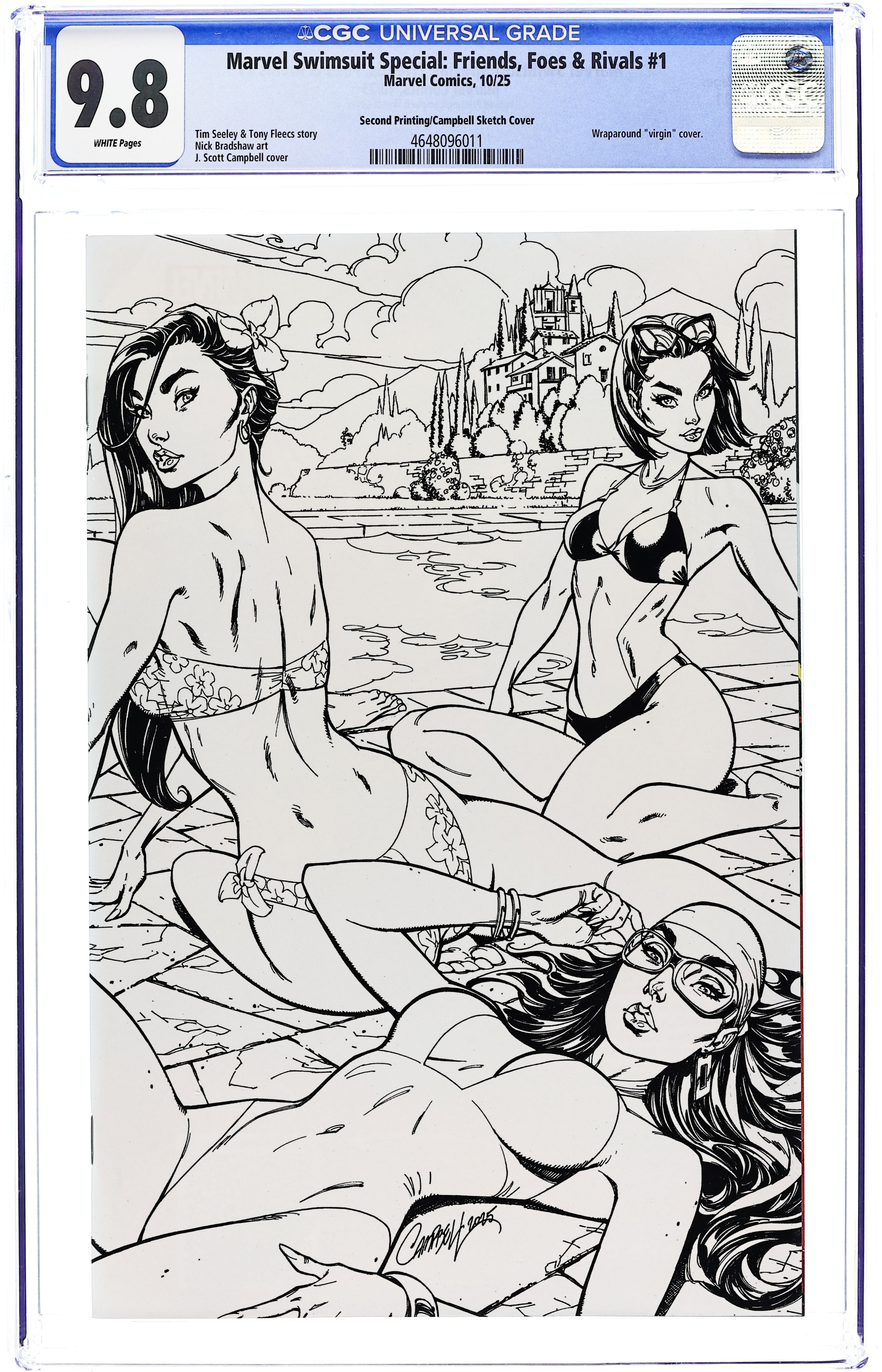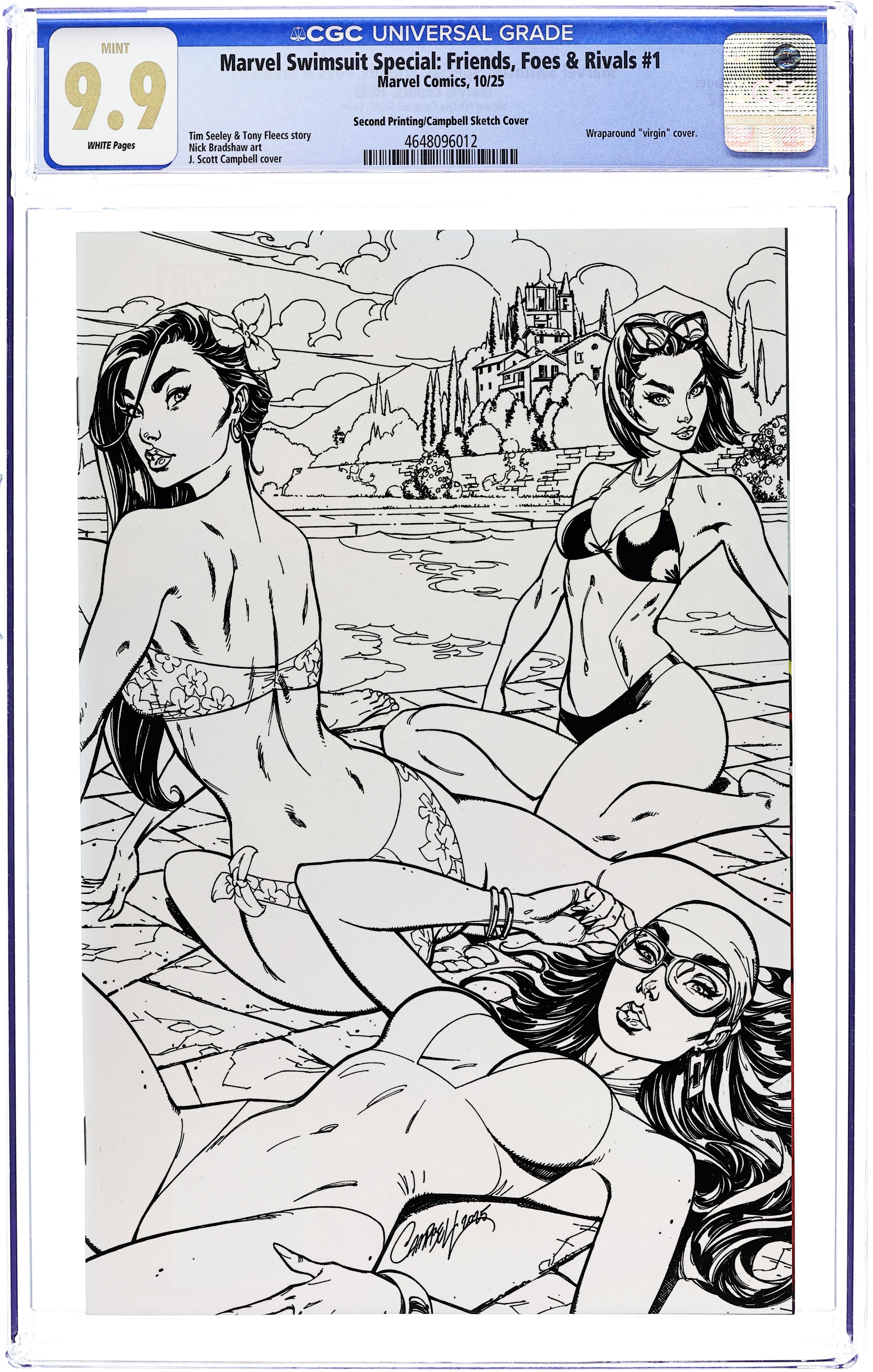 2nd Printing. Limited 1 for 25 Retailer Incentive Variant Cover. Written by Tim Seeley and Tony Fleecs. Cover by J Scott Campbell. Art by Nick Bradshaw. (for 15-page story), Joshua Cassara (X-Men pin-up), Marguerite Sauvage (Rogue and Gambit pin-up), Mahmud Asrar (Black Cat and Spider-Man pin-up), Aaron Kuder (Fantastic Four pin-up, plus reprint Deadpool/Wolverine cover art as pin-up), John Tyler Christopher (reprint Deadpool cover art as pin-up), Ron Lim (pin-up), Nic Klein (pin-up), David Marquez (Cloak and Dagger pin-up), Olivier Coipel (reprint Namor cover art as pin-up), Mirka Andolfo (Rocket Raccoon and Gamora pin-up), Rian Gonzales (reprint Venom cover art as pin-up), Ryusei Yamada (Captain Marvel pin-up), Luciano Vecchio (Power Man and Iron Fist pin-up) and Adam Hughes (reprint Sensational She-Hulk cover art as pin-up). THE SWIMSUIT SPECIAL RETURNS! Roxxon Comics is at it again when they release their own UNAUTHORIZED SWIMSUIT SPECIAL! Wasp is on the case and seizes the opportunity for Marvel's heroes to do their OWN swimwear fashion shoot all over the world! But fear not, True Believers, we know what you're REALLY here for! This super-sized special features splash page after splash page of gorgeous art, but with a story so you can pretend you're "reading it for the articles"… 40 pages, full color. Rated T+ Cover price $5.99.