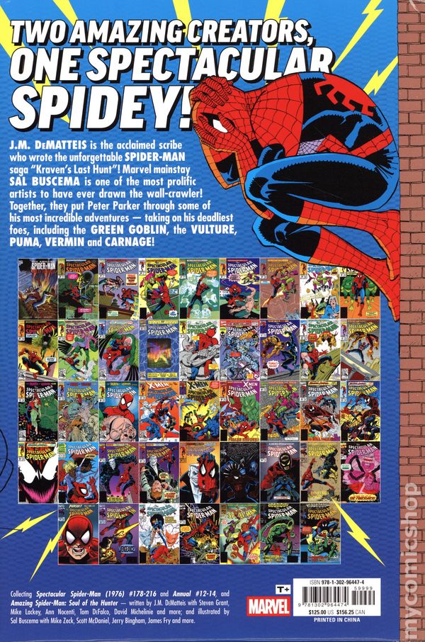 1st printing. Collects The Spectacular Spider-Man (1976-1998 1st Series) #178-216, The Spectacular Spider-Man (1976-1998 1st Series) Annual #12-14 and The Amazing Spider-Man: Soul of the Hunter (1992 Marvel). Written by J.M. DeMatteis, Steven Grant, Mike Lackey, Ann Nocenti, Tom DeFalco, Todd Dezago, David Michelinie, and D. Blaise. Art by Sal Buscema, James Fry, Scott McDaniel, Jerry Bingham, Mike Zeck, Rodney Ramos, , Keith Williams, and Michael Higgins. Cover by Sal Buscema. Two all-time Spidey greats collaborate on a thrilling era for the webbed wonder! When Peter Parker encounters his old foe Vermin, it brings back haunting memories of one of the darkest chapters of his life! But his old friend Harry Osborn is similarly haunted, only he channels it into terrorizing Spider-Man as the Green Goblin! Brace yourself for a psychological showdown between two archfoes! And the threats don't end there! The Vulture is dying, but he's determined to go out in style! The Rhino's on a rampage, the Puma's on the prowl and Professor Power is prepared to go toe-to-toe with Spidey and the X-Men! "Maximum Carnage" unleashes symbiotic chaos, and the whispering menace Tombstone is back - more lethal than ever! Plus: The web-slinger battles the Shroud, the Foreigner, Typhoid Mary, the Scorpion and more! Hardcover, 8 1/2-in. x 11-in., 1,200 pages, full color. Rated T+ Cover price $125.00.