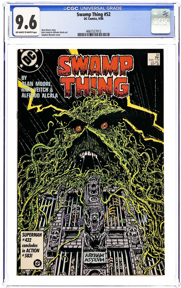 The Jungle Line! - Written by Alan Moore. Art by Rick Veitch and Al Williamson. Cover by Rick Veitch. Superman is dying and the only one that may be able to help him is the enigmatic creature of the Green known as Swamp Thing. Characters in this issue: Batman [Bruce Wayne] (cameo); The Flash [Barry Allen] (cameo); Lana Lang; Jimmy Olsen (cameo); Superman [Clark Kent]; Swamp Thing [Alec Holland]; Wonder Woman [Princess Diana] (cameo); Dr. Everett; Bloodmorel (a fungus). 32 pages, full color. Cover price $0.75.