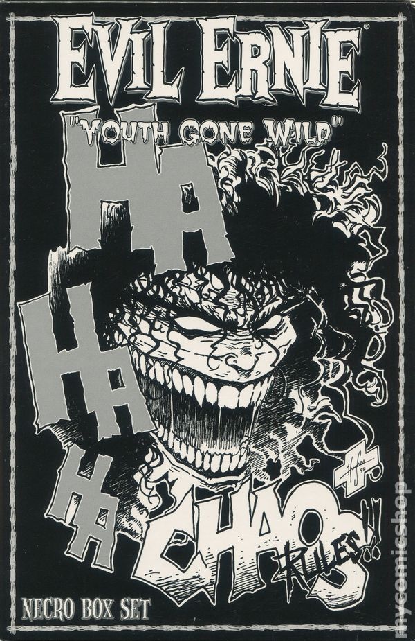 Limited to 2000 copies. This premium, limited edition boxed set compiles the nefarious "Youth Gone Wild" mini-series (Evil Ernie #1-#5) that launched a horror legend. These all premium, never before seen Necro editions are strictly limited to 2000 sets. Comes with a "Death Certificate of Authenticity" signed by creator Brian Pulido and illustrator Steven Hughes. Box set includes Evil Ernie Youth Gone Wild Encore Edition #1-5 and Certificate of authenticity. Cover price $35.00.