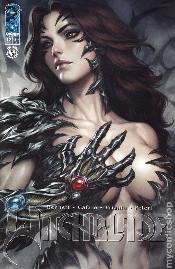 Limited 1 for 25 Retailer Incentive Variant Cover. Written by Marguerite Bennett. Art by Giuseppe Cafaro, Arif Prianto. Cover by Marc Silvestri. NEW STORY ARC New York City Police Detective Sara Pezzini is this generation's bearer of the Witchblade, a mystical gauntlet wielded by one woman in a generation meant to balance the forces of Darkness and Light. For years, Sara has been on the hunt for the identity of her father's killer, and the paths have led her to billionaire Kenneth Irons. Irons has money, power, and associates from the darkest corners of the underworld. Among them, a young member of the Franchetti crime family on the verge of his twenty-first birthday, enters the story, and Sara's world will never be the same as Jackie Estacado, this generation's bearer of The Darkness, makes his first appearance and rocks the Top Cow Universe to its core! 32 pages, full color. Rated T+ Cover price $3.99.