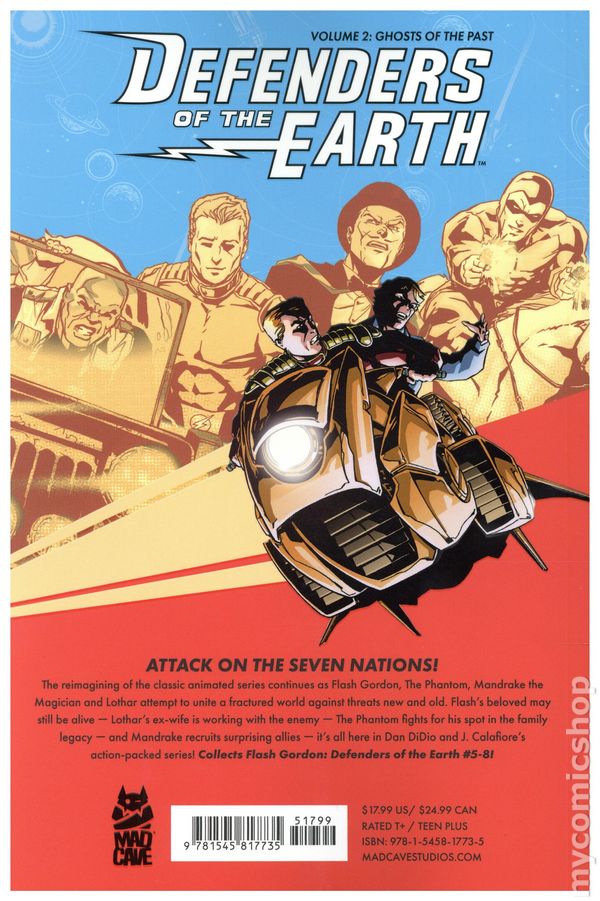 Volume 2 - 1st printing. "Ghosts of the Past!" Collects Defenders of the Earth (2024 Mad Cave) #5-8. Written by Dan DiDio. Art by Jim Calafiore, Matt Horak, Brent Schoonover, and Sal Velluto. Cover by Jim Calafiore. Assault on the Seven Nations! The reimagining of the classic animated series continues as Flash Gordon, The Phantom, Mandrake the Magician and Lothar attempt to unite a fractured world against threats new and old. Flash's beloved may still be alive -- Lothar's ex-wife is working with the enemy -- The Phantom fights for his spot in the family legacy -- and Mandrake recruits surprising allies -- it's all here in Dan DiDio and J. Calafiore's action-packed series! Softcover, 112 pages, full color. Teen Cover price $17.99.