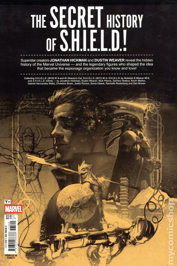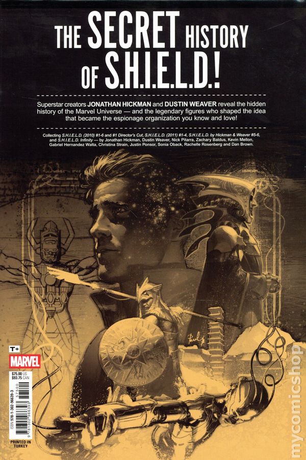 1st printing. Collects SHIELD (2010 Marvel 2nd Series) #1-6 and DIRECTOR'S CUT, SHIELD (2011-2018 Marvel 3rd Series) #1-6, and SHIELD Infinity (2011 Marvel). Written by Jonathan Hickman. Art and cover by Dustin Weaver. Back Cover by Gerald Parel. Superstar creators Jonathan Hickman and Dustin Weaver embed historical figures into the secret history of S.H.I.E.L.D! Leonardo da Vinci was an agent of S.H.I.E.L.D. So was Issac Newton. So were Imhotep and Zhang Heng and Galileo and other geniuses throughout time. They were the first heroes to defeat Galactus and the Brood and turn Celestials back. They saved the world long before Captain America or Iron Man were ever born, but what does this mean to our heroes of today? What does this mean to Nick Fury? Michelangelo has been pulling the strings for years, but can even he keep da Vinci and Newton from killing each other and destroying the Brotherhood of the Shield? The battle for the Immortal City is on as the truth behind Nostradamus is uncovered, and Howard Stark lays the foundation for the espionage organization you know and love! But the battle that decides our present will be fought in the future! Hardcover, 8 1/2-in. x 11-in., 384 pages, full color. Rated T+ Cover price $75.00.