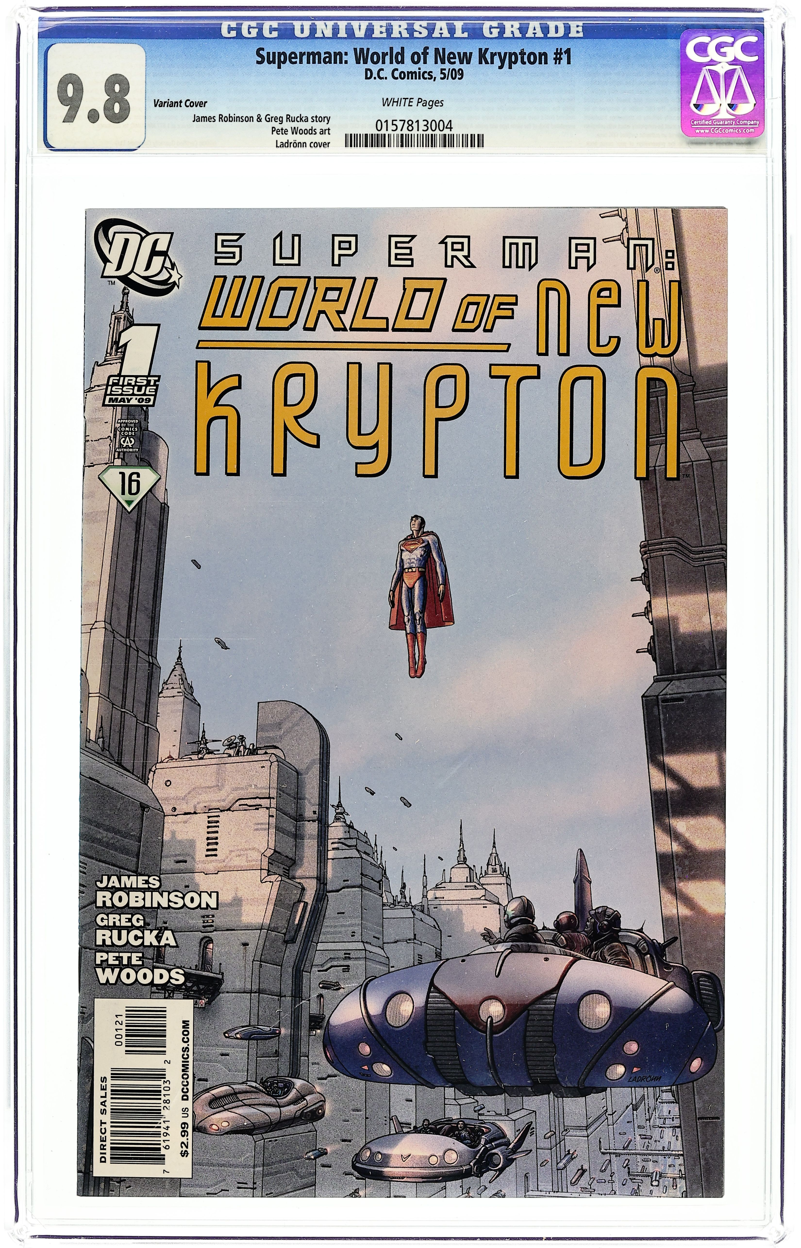 Limited Edition (1 for 25) Variant cover by Ladrönn. Written by James Robinson & Greg Rucka. Art by Pete Woods. Following the events of the 'New Krypton' crossover, the Man of Steel has had to embrace his past to ensure humanity's future. And while a devastating armed conflict with Earth may have been averted, keeping the peace will be Superman's greatest challenge yet. Hot new writer Andrew Kreisberg (BATMAN CONFIDENTIAL) and fan-favorite artist Pete Woods (ACTION COMICS, SUPERMAN: UP, UP AND AWAY!) lead Superman through a world of interstellar treachery and deadly machinations where the lives of two races hang in the balance! 1 of 12 32 pg, FC Cover price $2.99.