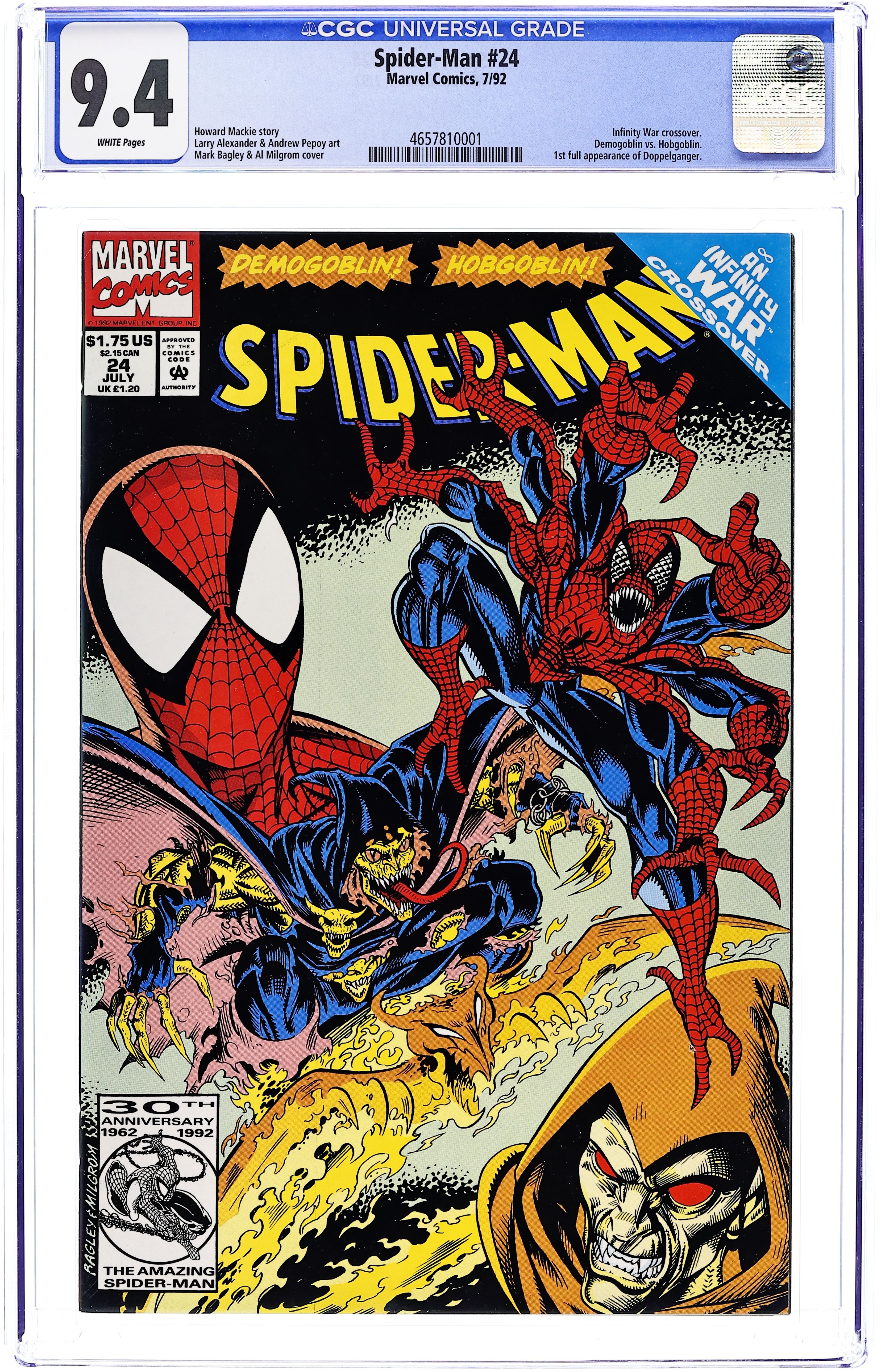 Starts Jan 3 Direct Edition. Infinity War crossover - "Double Infinity" Script by Howard Mackie.Pencils by Larry Alexander. Inks by Andrew Pepoy. Cover by Mark Bagley andAl Milgrom. Two men -- Peter Parker and Jason Macendale -- are having ahard time sleeping tonight. They are both haunted in their dreams bysomeone. The web-slinger doesn't know his tormentor, but the Hobgoblinknows his: the Demogoblin! Both men head to Times Square to face theirdemons...and wind up in a four-way free-for-all in the night skies!Spider-Man vs. his eight-limbed doppelganger vs. the Hobgoblin vs. theDemogoblin! Could the wall-crawler really team up with the Hobgoblin toachieve victory? Stranger things have happened! Cameo appearance by MaryJane Watson. First appearance of the Spider-Man Doppelganger. (Note: Thisstory overlaps with Infinity War (1992) #1.) 32 pages. Cover price $1.75.