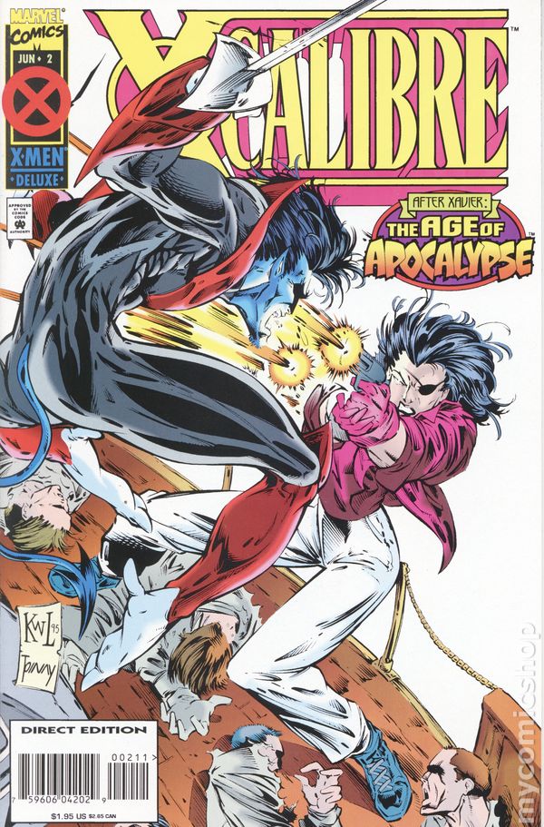 Cover pencils by Ken Lashley, inks by Tom Wegrzyn. Age of Apocalypse; "The Infernal Gallop," script by Warren Ellis, pencils by Ken Lashley, inks by Tom Wegrzyn, Phil Moy, and Bud LaRosa; Switchback is taken to Avalon by Mystique; On orders from Magneto, Nightcrawler contacts Angel for help in finding his mother; Magneto commands Mystique to enter Avalon and contact Destiny; Kurt makes plans with Proudstar to get him to Avalon but their plans are overheard by Moonstar; She reports to Apocalypse who sends his own agents to find Avalon and destroy it; Destiny meets Switchback and foresees the end of Avalon; Cain (aka Juggernaut), Switchback, Angel, Nightcrawler, Magneto, Mystique, John Proudstar, Danielle Moonstar, Apocalypse, Damask, Destiny app; pin-ups of Magneto and Rogue, Legion, and The X-Men. Text piece about the Age of Apocolypse. 36 pgs., full color. $1.95. Cover price $1.95.